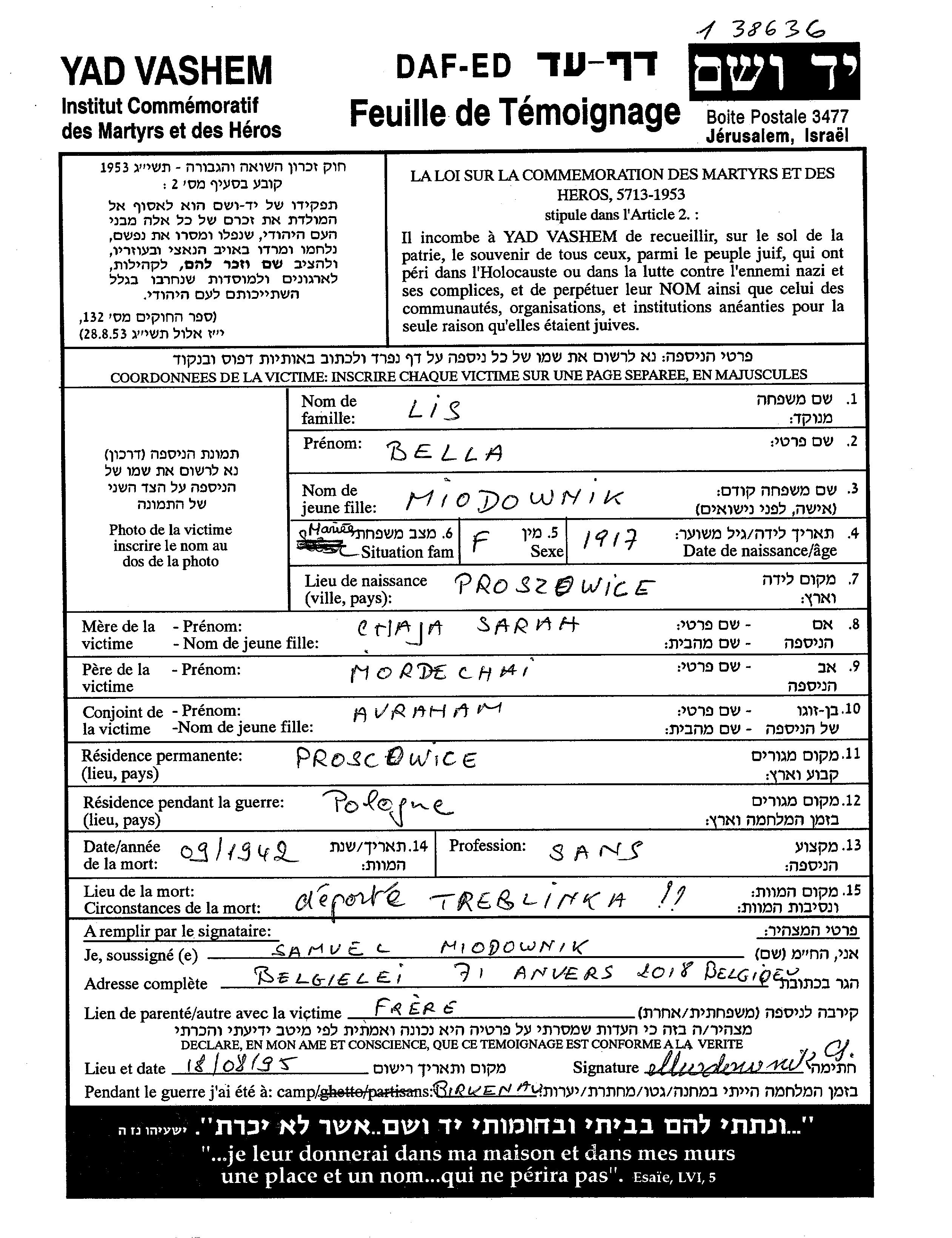 Lis Beila Proszowice, Poland Page of Testimony