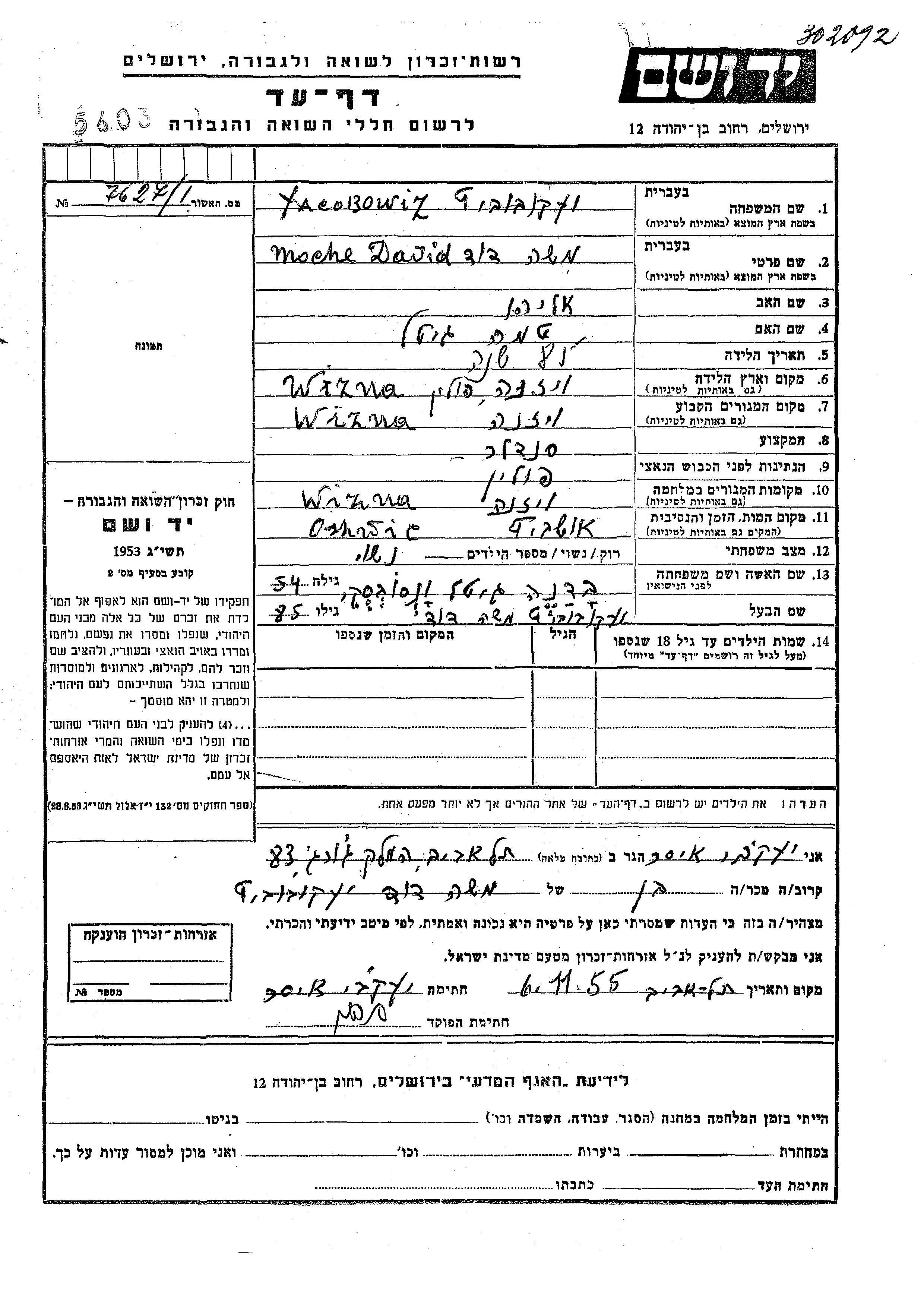 Moche David Yacobowiz was born in Wizna, Poland to Eliahu and Tema Gitel. He was a shoemaker and married to Badana Gitel nee Vonsovski. Prior to WWII he lived in Wizna, Poland. During the war he was in Wizna, Poland. Moche David was murdered in the Shoah. Place of death: Auschwitz, Poland.