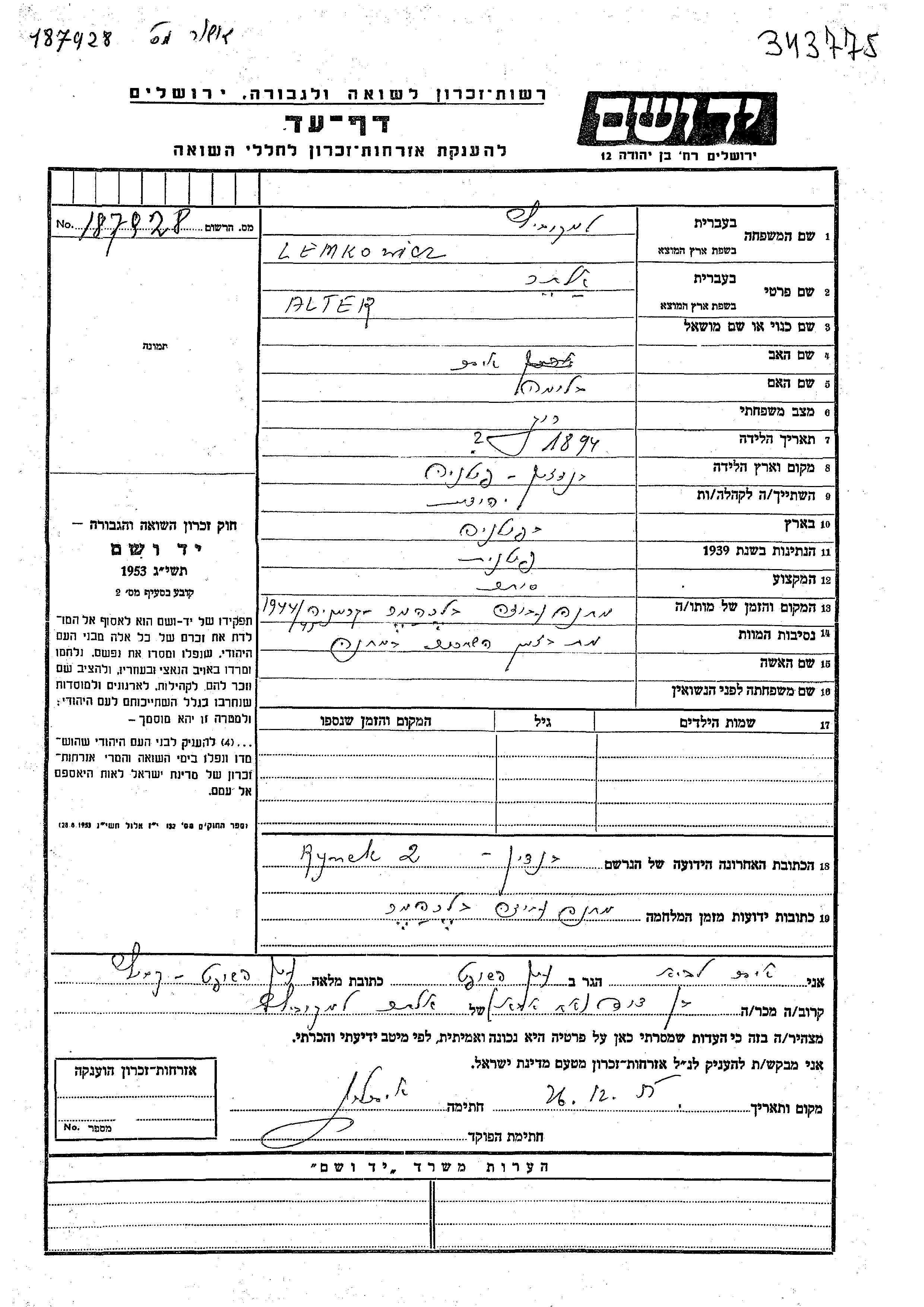 Alter Lemkowicz was born in Bendzin, Poland, 1894 to Isser and Bluma. He was a merchant and single. Prior to WWII he lived in Bendzin, Poland. During the war he was in Blechhammer, Germany.