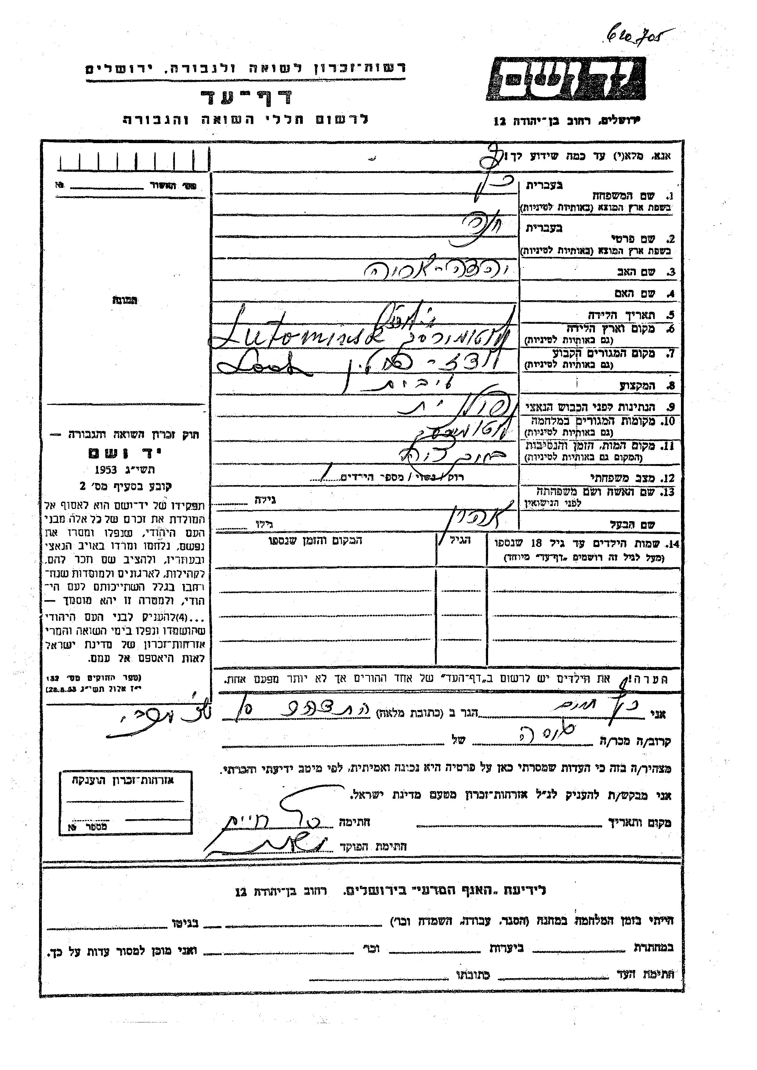 Khana Katz was born in Lutomiersk, Poland to Yehuda Arie. She was a housewife and married to Aharon. Prior to WWII she lived in Lodz, Poland. During the war she was in Lutomiersk, Poland. Khana was murdered in the Shoah.