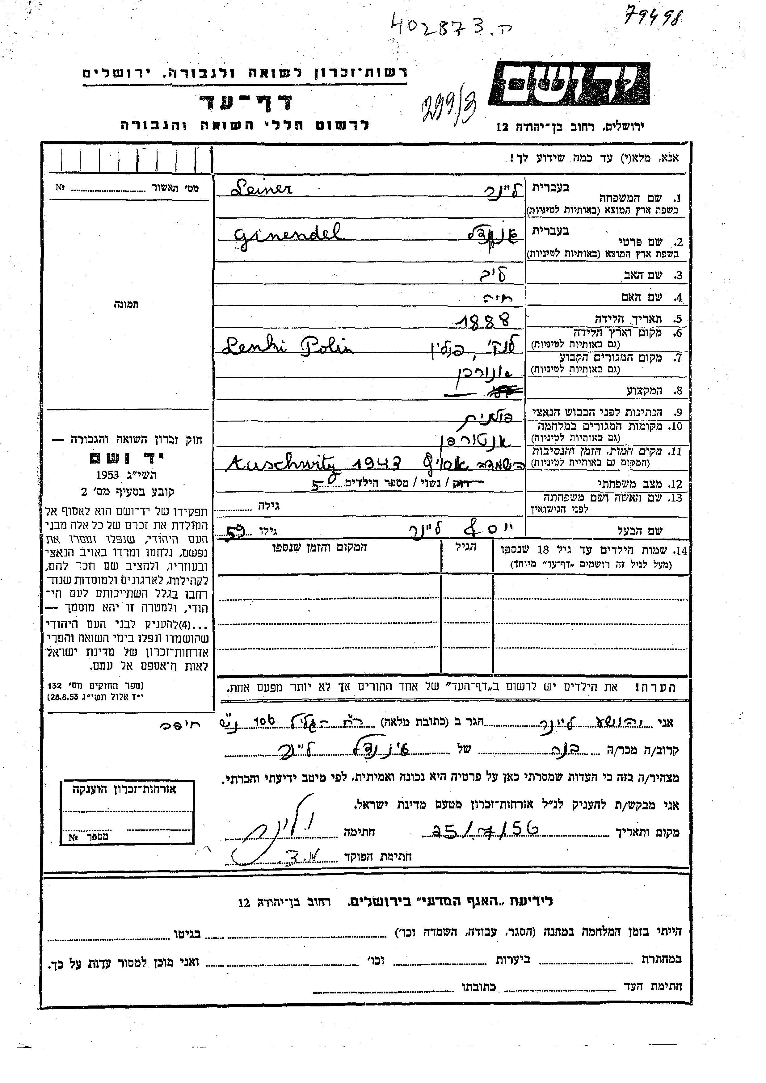 Ginendel Lainer was born in Lenki, Poland, 1888 to Leib and Khaia. She was married to Yosef. Prior to WWII she lived in Lenki, Poland. During the war she was in Antwerpen, Belgium. Ginendel was murdered in the Shoah. Place of death: Auschwitz, Poland, 1943.