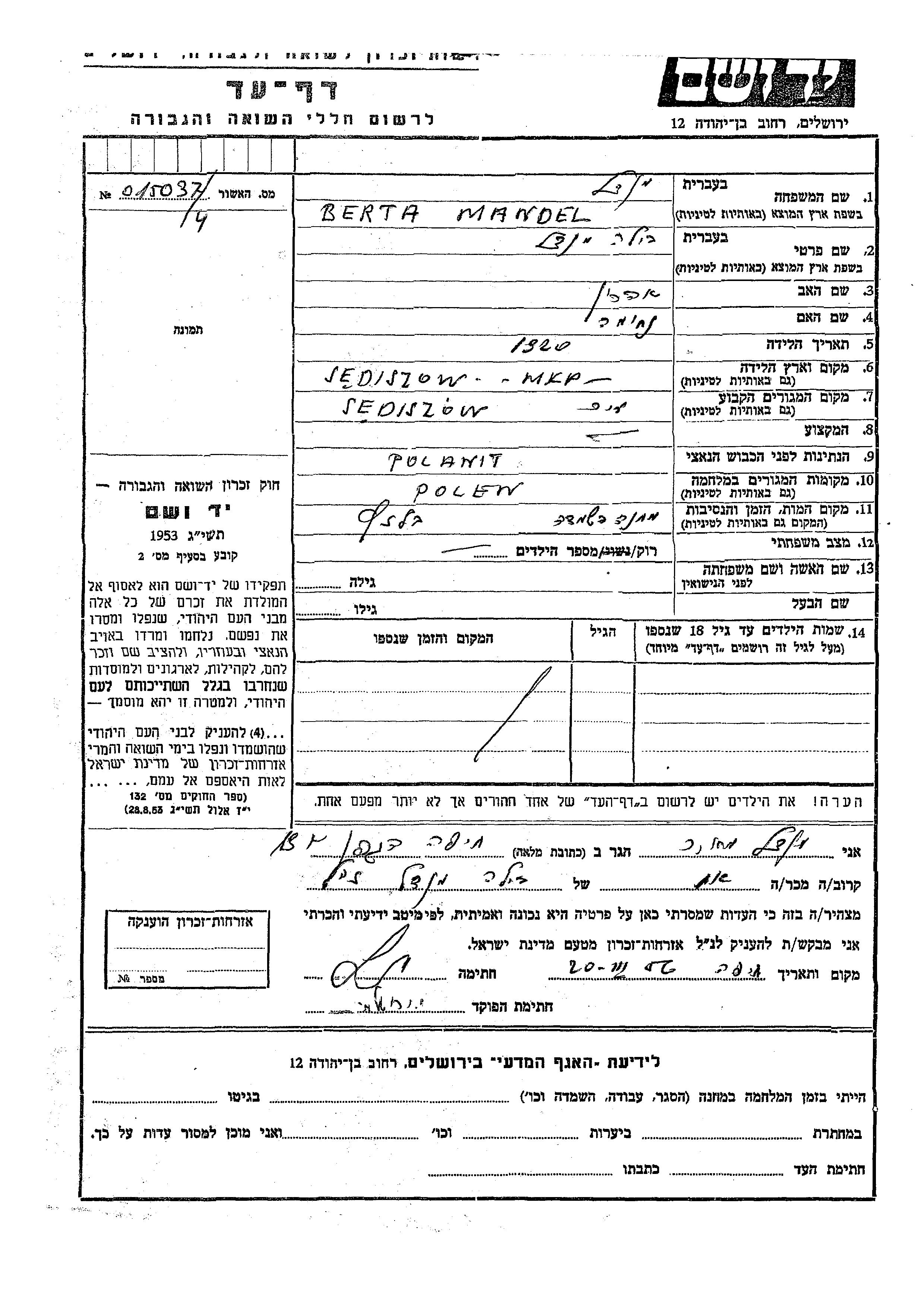 Bila Berta Mandel was born in Sedziszow Malopolski, Poland, 1920 to Aharon and Nekhuma. She was single. Prior to WWII she lived in Sedziszow Malopolski, Poland. During the war she was in Poland. Bila Berta was murdered in the Shoah. Place of death: Belzec, Poland.