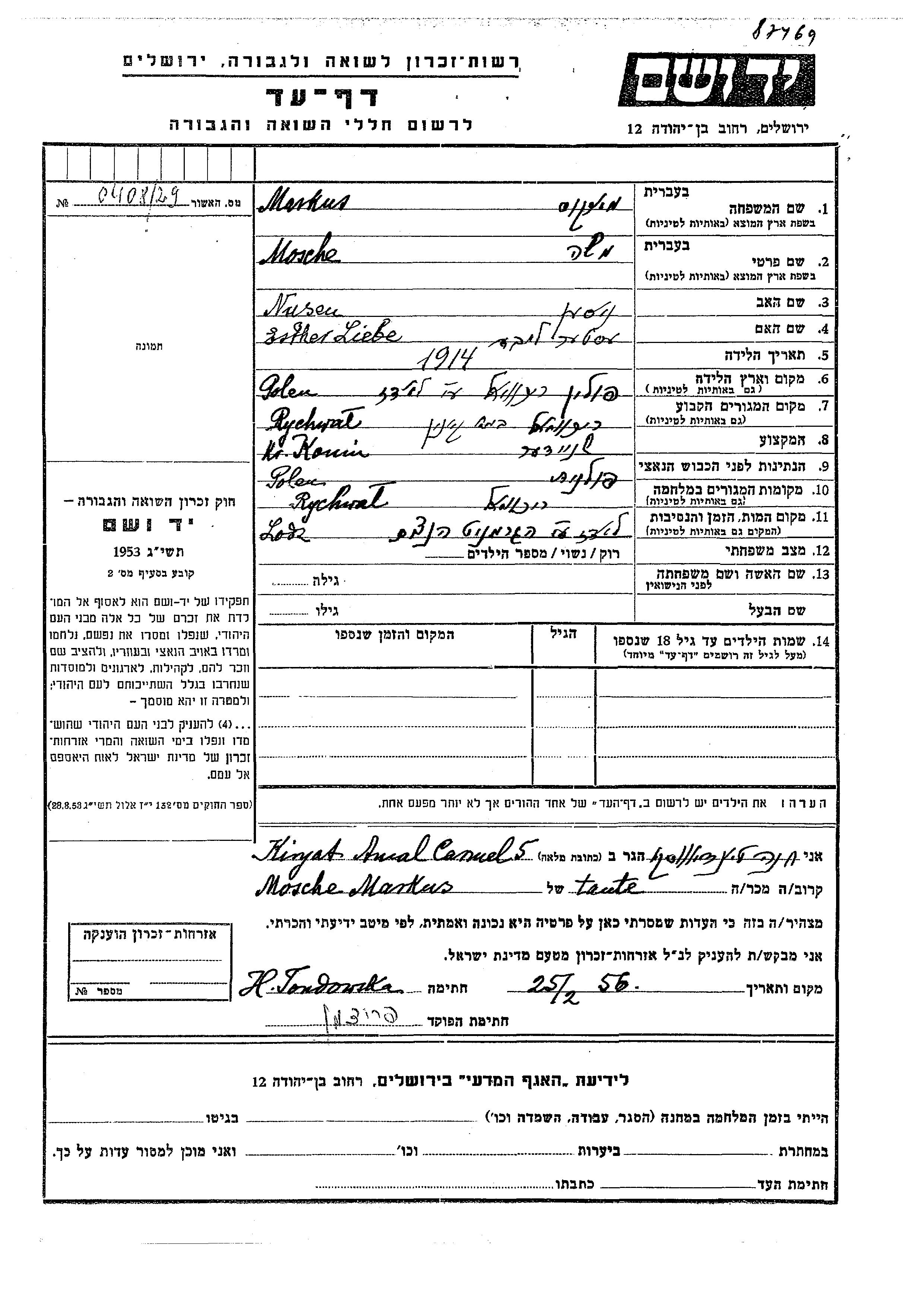 Mosche Markus was born in Rychwal, Poland, 1914 to Nusen Nisen and Esther Liebe. He was a tailor. Prior to WWII he lived in Rychwal, Poland. During the war he was in Rychwal, Poland. Mosche was murdered in the Shoah. Place of death: Lodz, Poland.