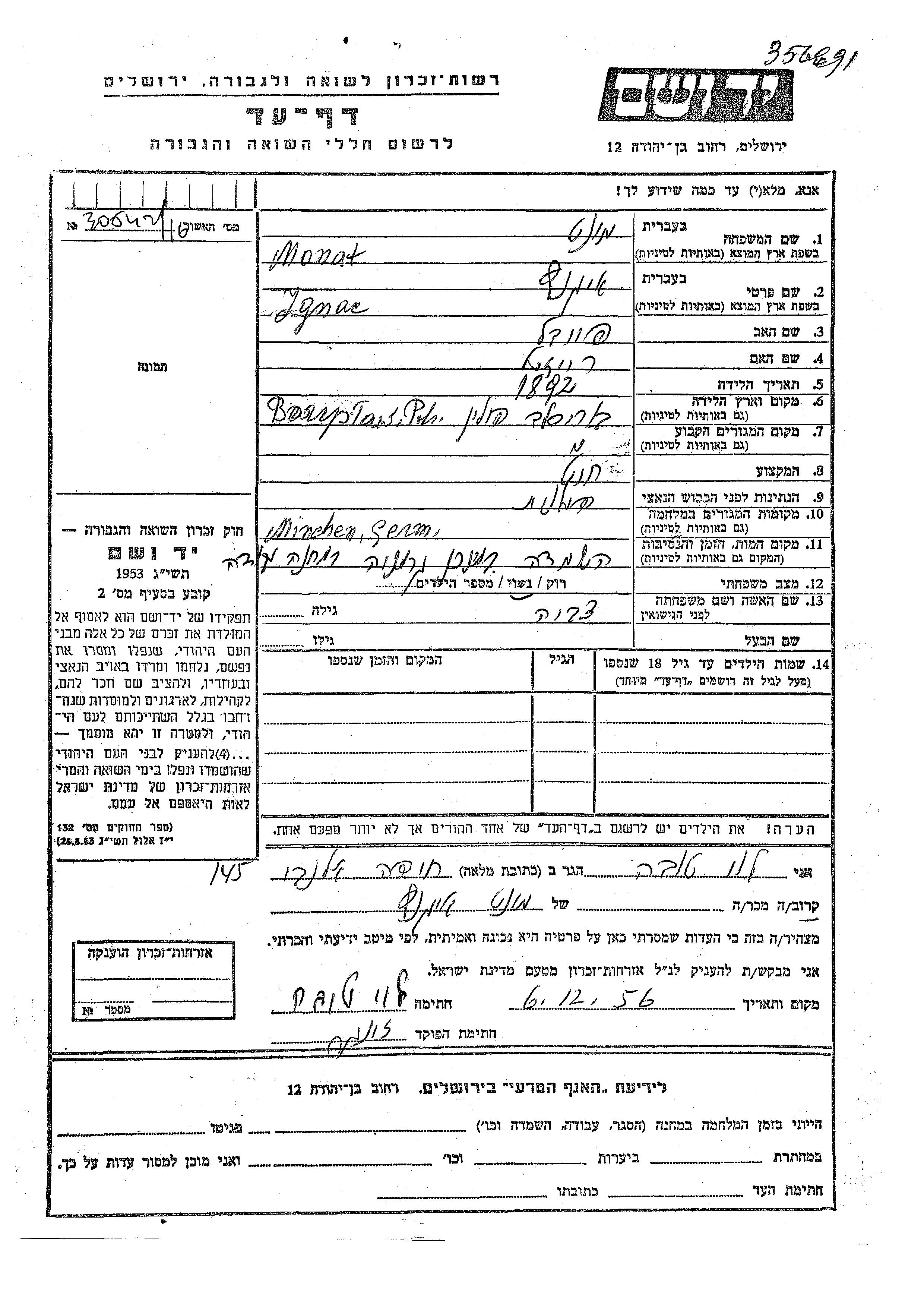 Ignac Monat was born in Boryslaw, Poland, 1892 to Faivel and Reizil. He was a tailor and married to Tzvia. Prior to WWII he lived in Boryslaw, Poland. During the war he was in Muenchen Milbertshofen, Germany. Ignac was murdered in the Shoah. Place of death: Muenchen Milbertshofen, Germany.