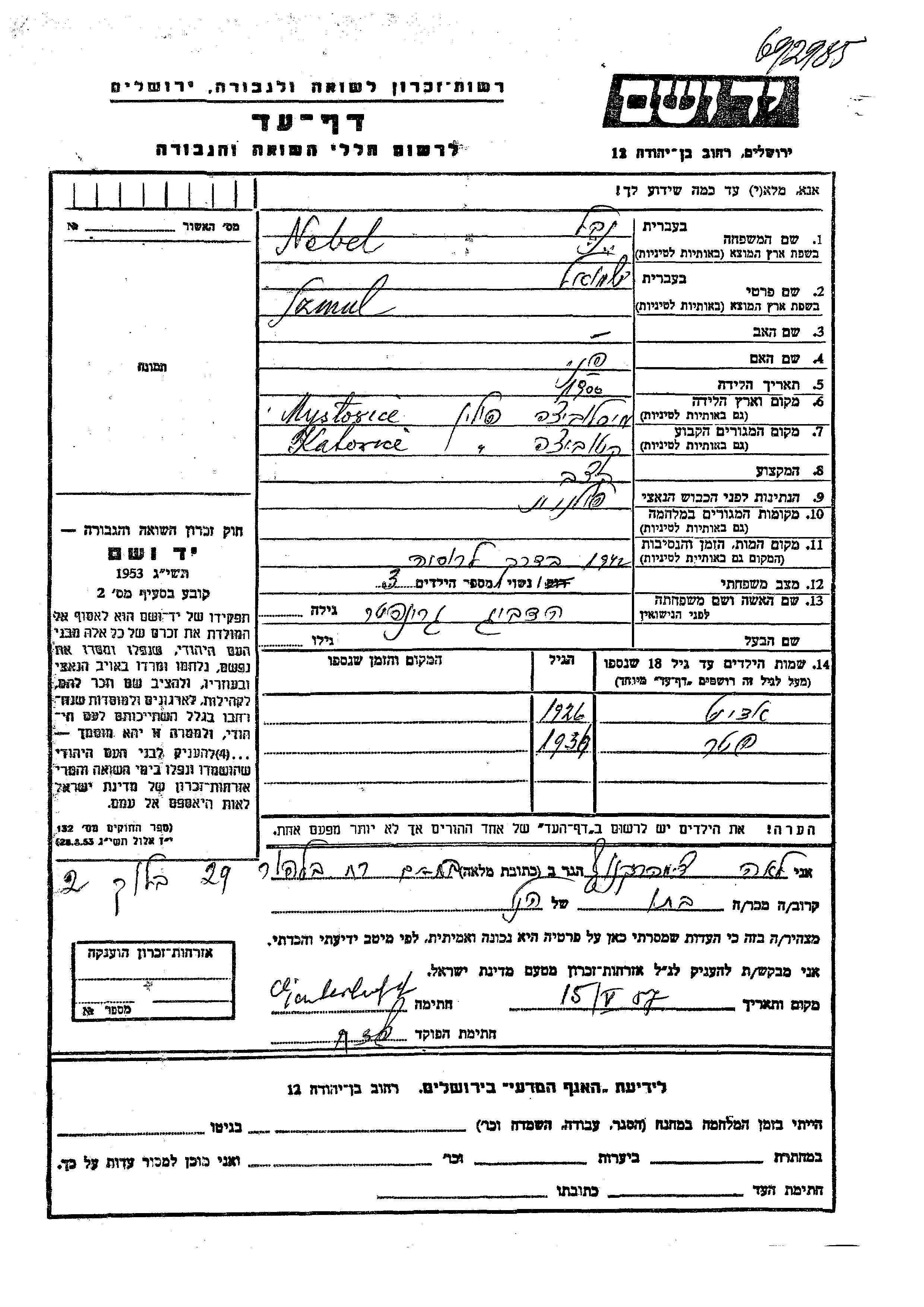 Szmul Nebel was born in Myslowice, Poland, 1900 to Fani. He was a butcher and married to Hedvig nee Grinpeter. Prior to WWII he lived in Katovitz, Poland. Szmul was murdered in the Shoah. Place of death: unknown, 1942.