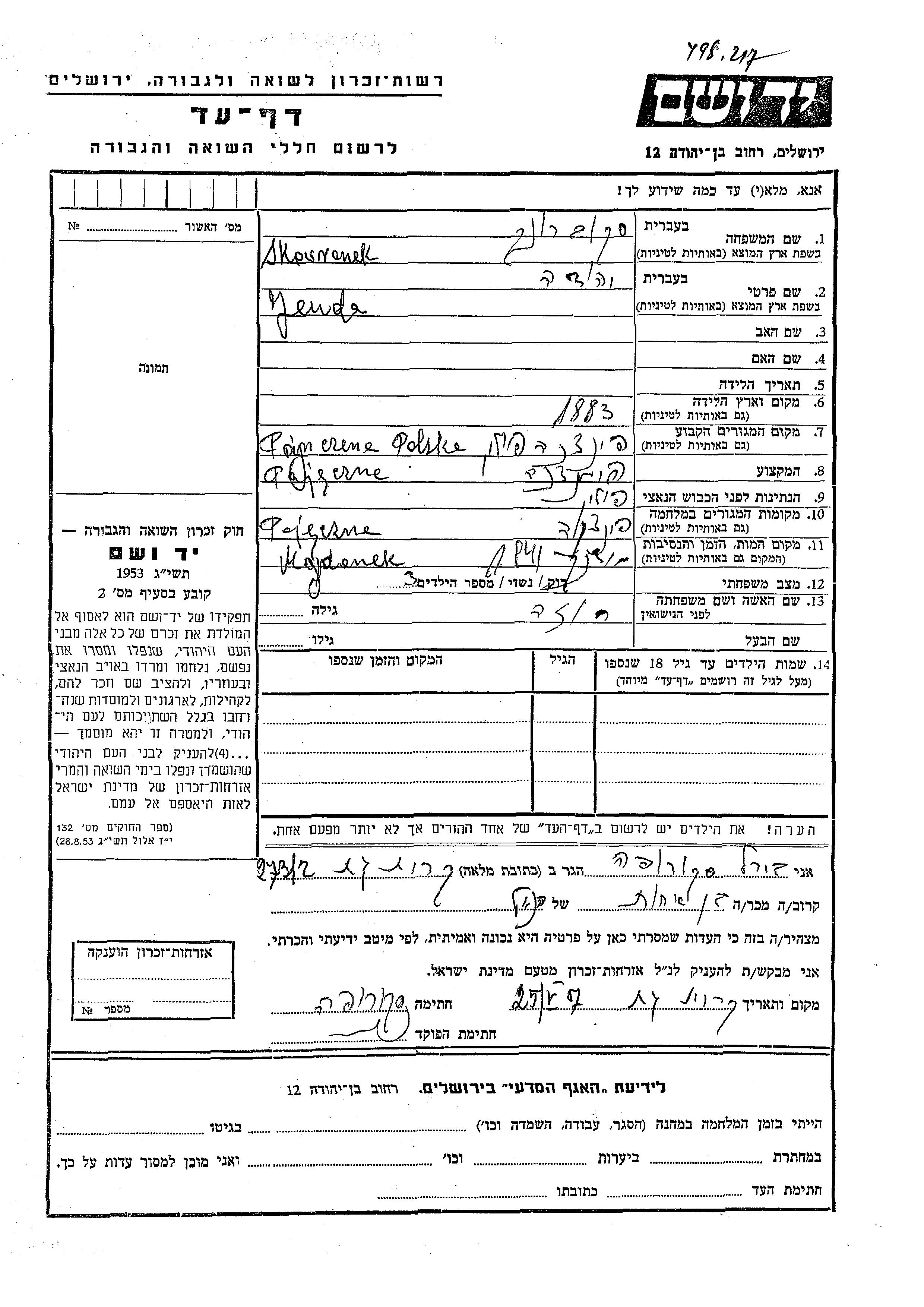 Yeuda Skovronek was born in Pajeczno, Poland, 1883. He was married to Roza. Prior to WWII he lived in Pajeczno, Poland. During the war he was in Pajeczno, Poland. Yeuda was murdered in the Shoah. Place of death: Majdanek, Poland, 1941.