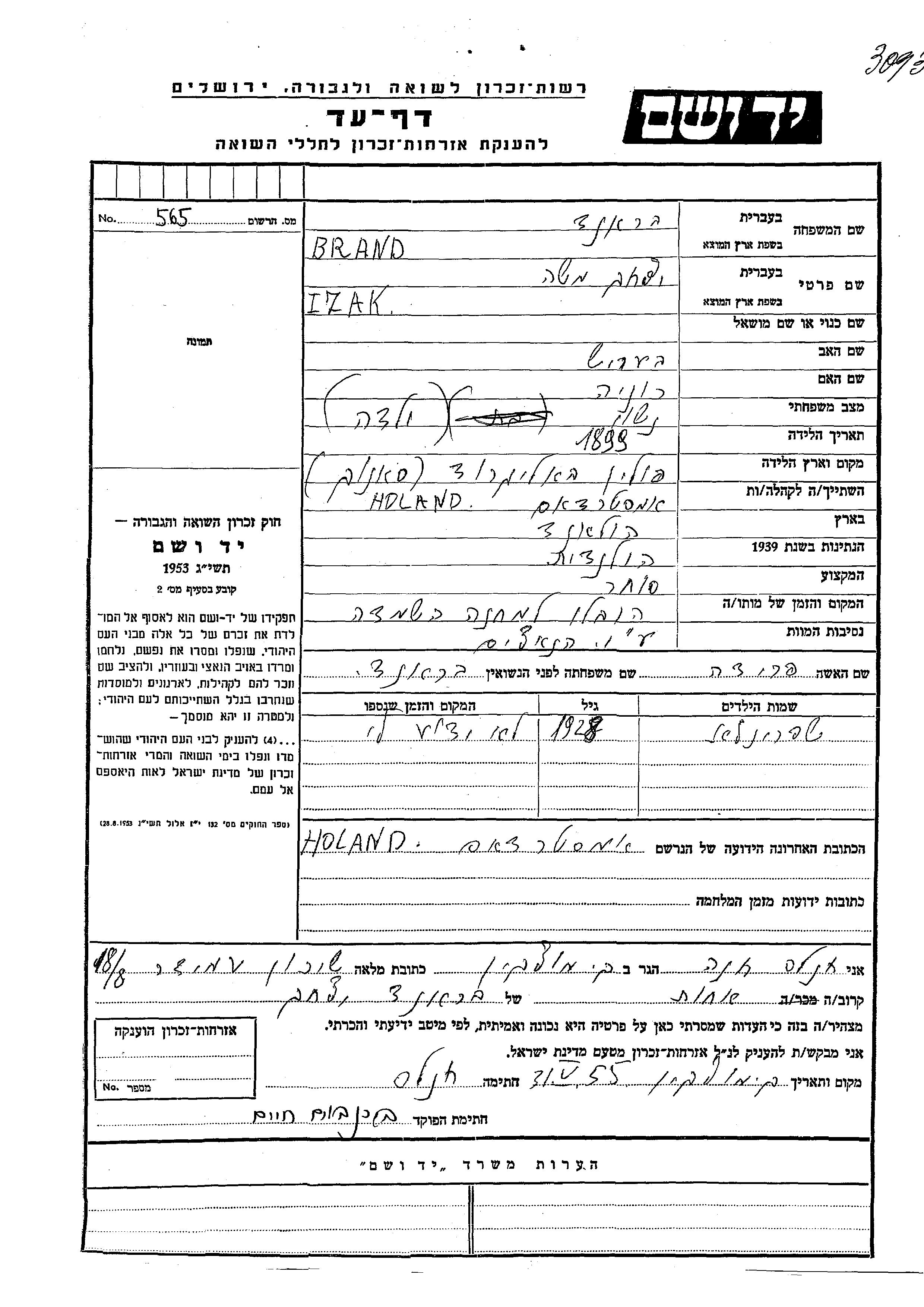 Brand Shpronala 1928 unstated place, Page of Testimony