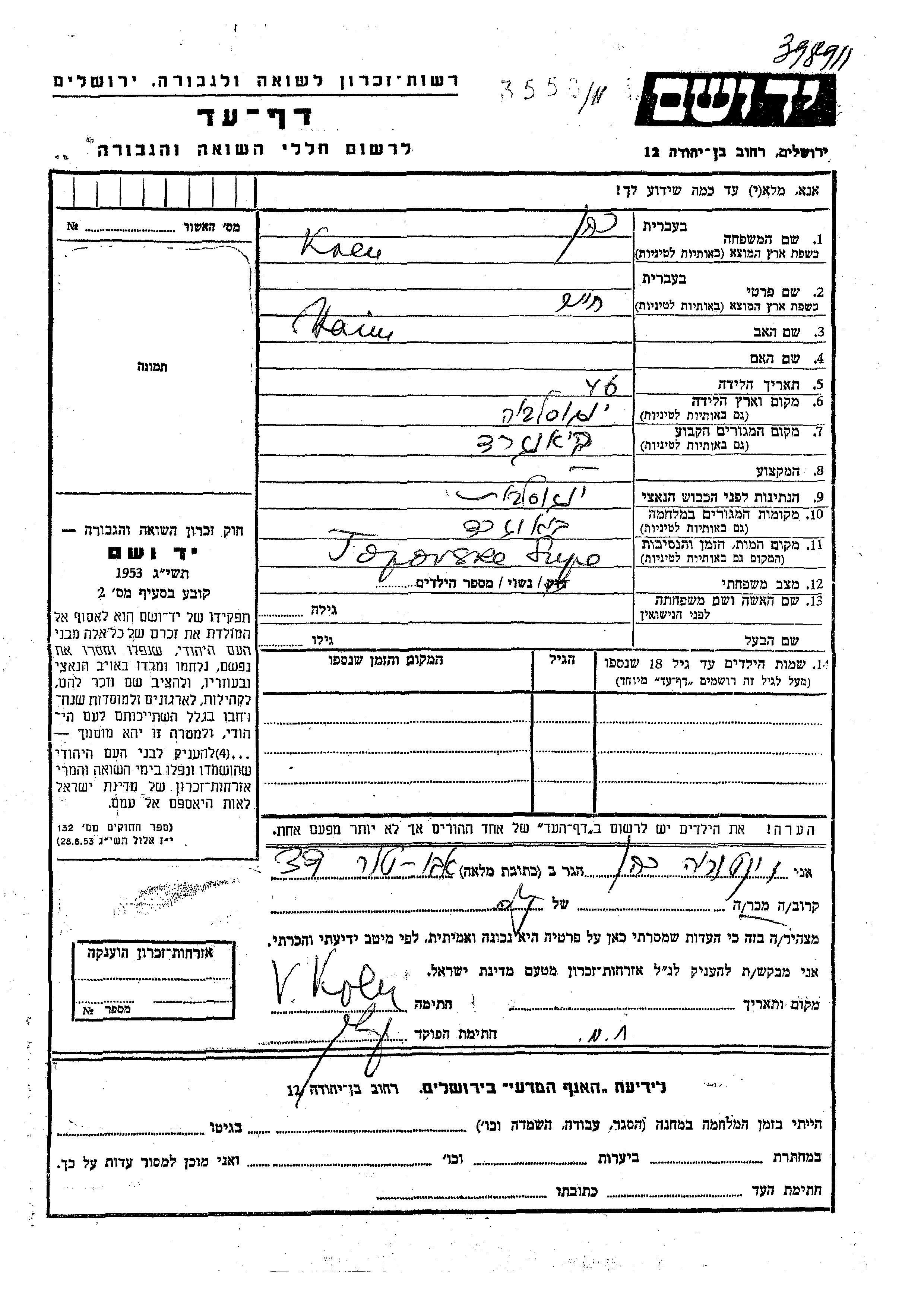 Yad Vashem - Pages of Testimony Names Memorial Collection