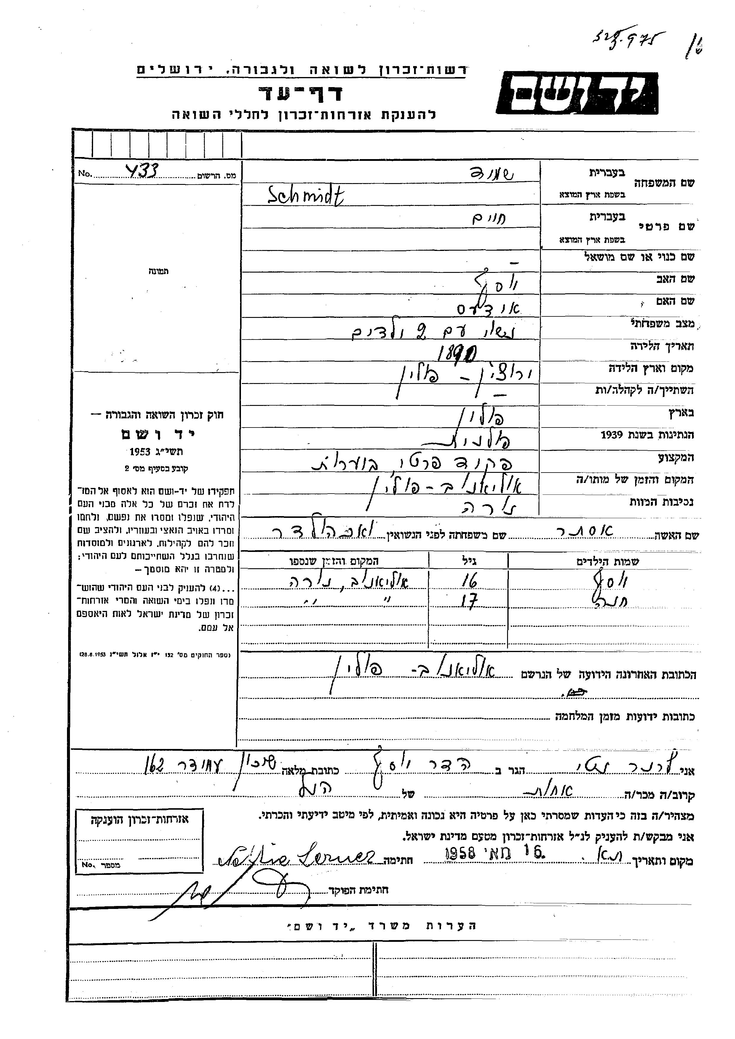 Schmidt Yosef Ulanow, Poland Page of Testimony