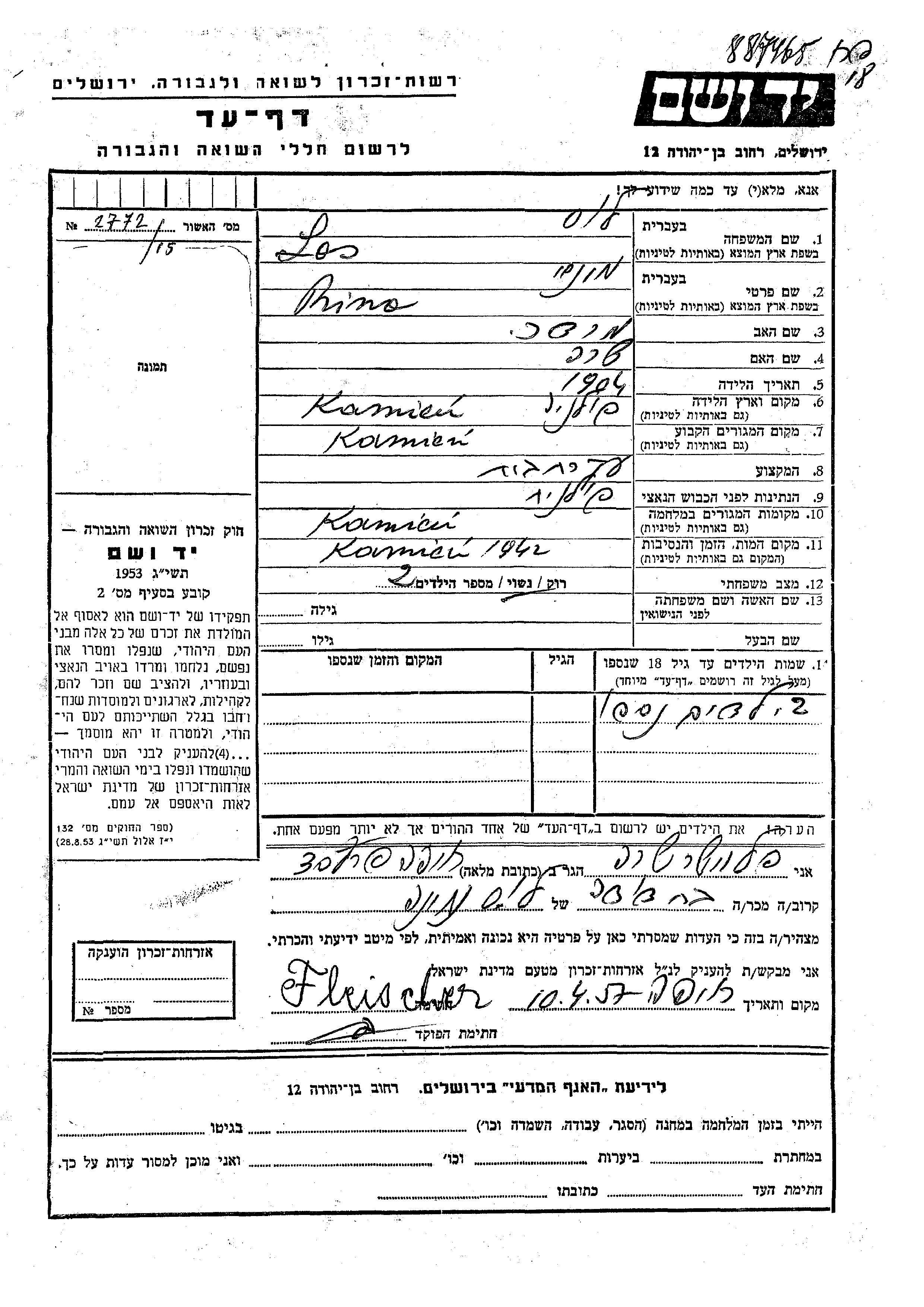 Mina Los was born in Kamien, Poland, 1904 to Mordekhai and Sara. She was a housewife and married. Prior to WWII she lived in Kamien, Poland. During the war she was in Kamien, Poland. Mina was murdered in the Shoah. Place of death: Kamien, Poland, 1942.
