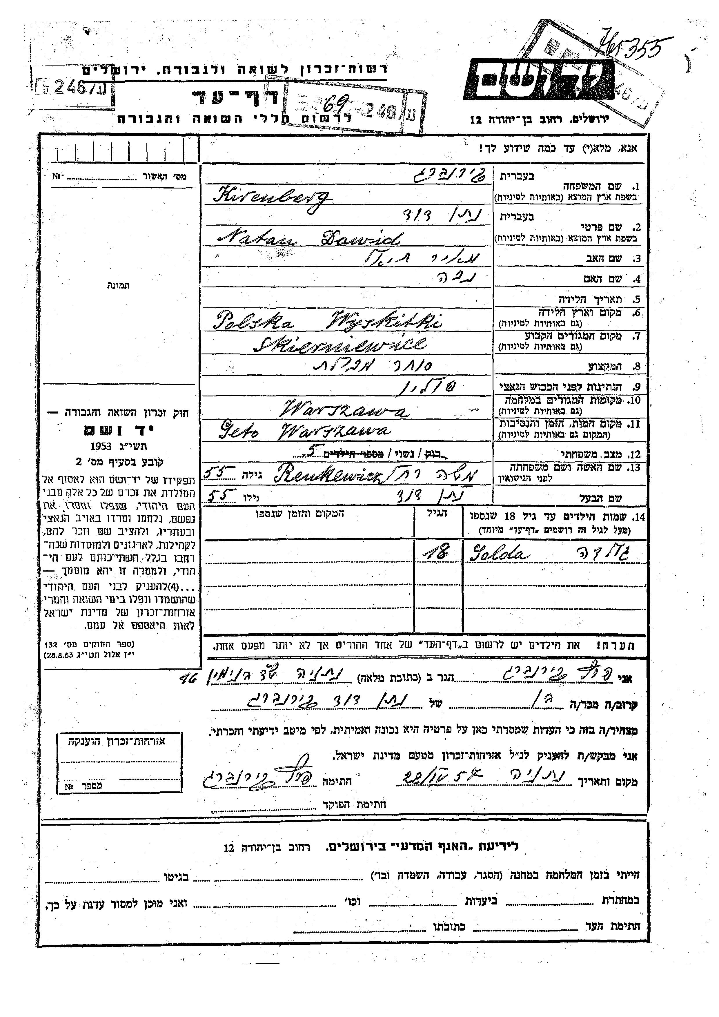 Golda Kirenberg was born to Dawid Natan and Moshe Rakhel. She was child. Prior to WWII she lived in Skierniewice, Poland. During the war she was in Warsaw, Poland.