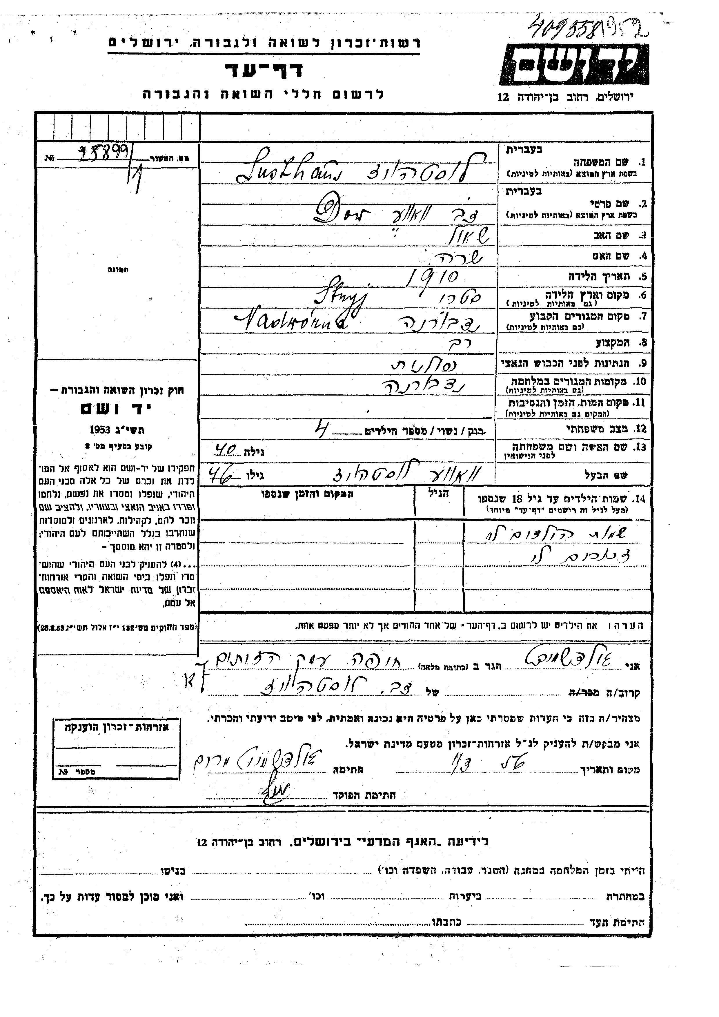 Dow Vove Lusthaus Lusthoiz was born in Stryj, Poland, 1910 to Shaul and Sara. He was a rabbi and married. Prior to WWII he lived in Nadworna, Poland. During the war he was in Nadworna, Poland. Dow Vove was murdered in the Shoah.
