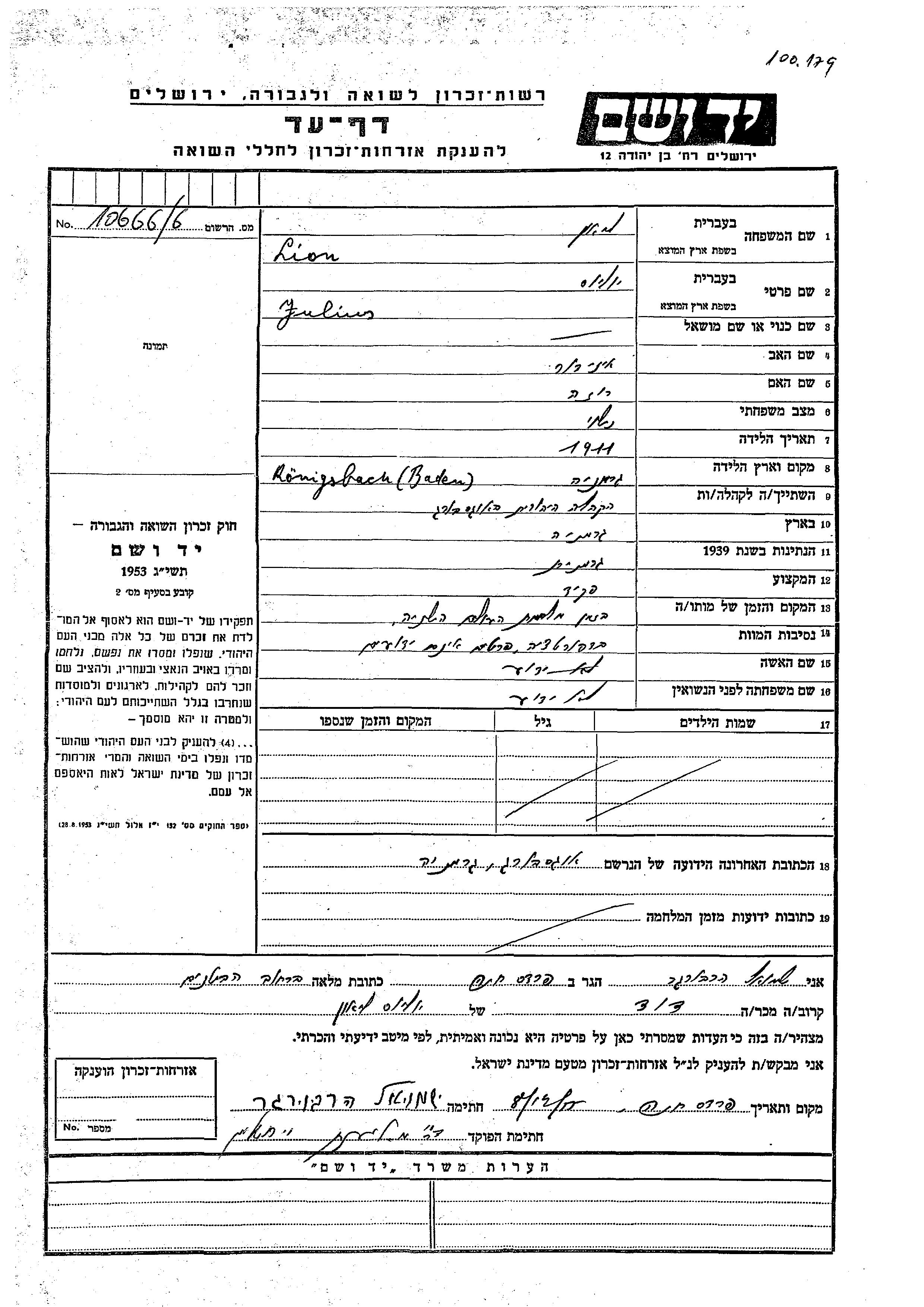 Lion Julius 1911 Germany Page of Testimony
