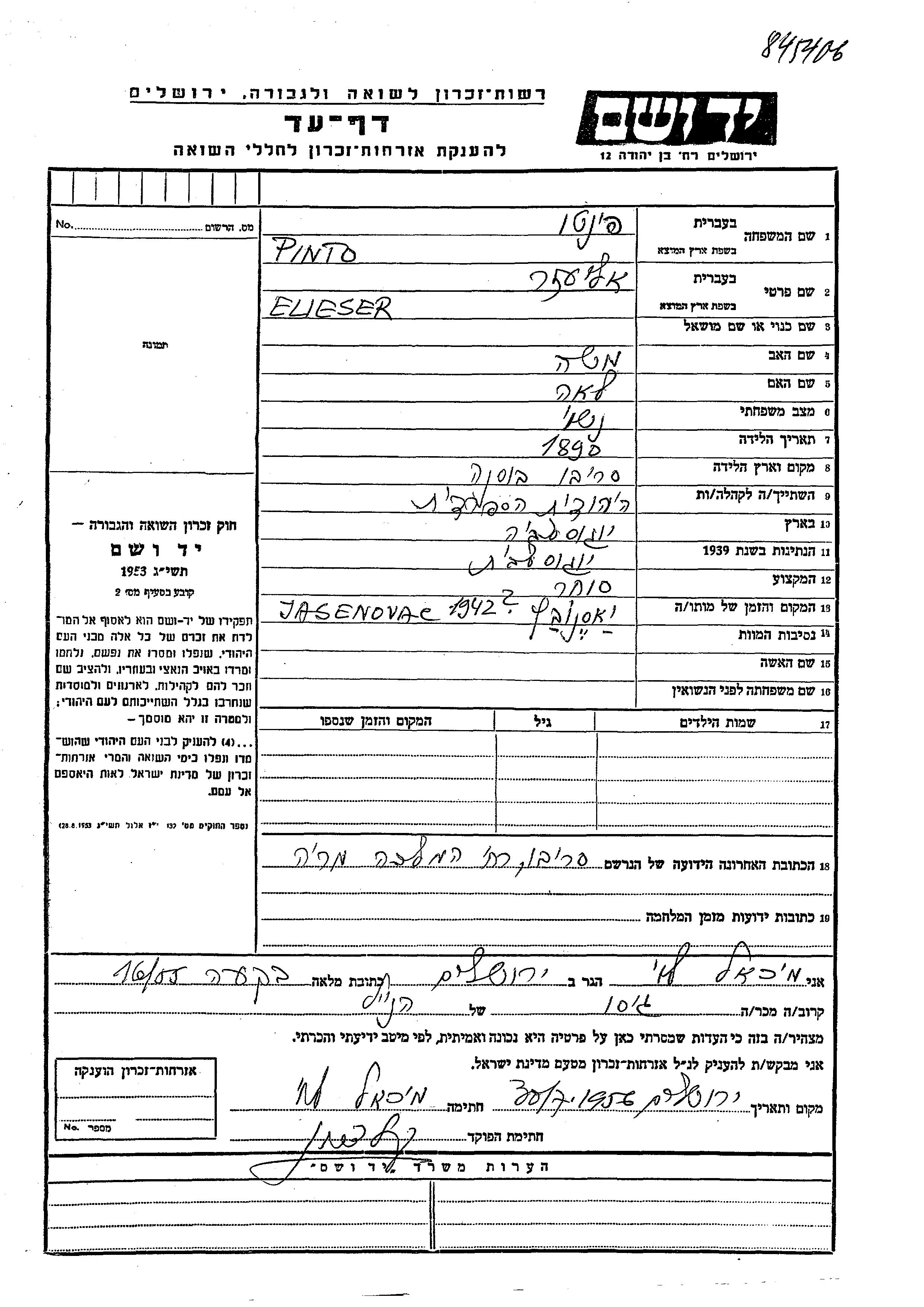 Elieser Pinto was born in Sarajevo, Yugoslavia, 1890 to Moshe and Lea. He was a merchant and married. Prior to WWII he lived in Sarajevo, Yugoslavia. Elieser was murdered in the Shoah. Place of death: Jasenovac, Yugoslavia, 1942.