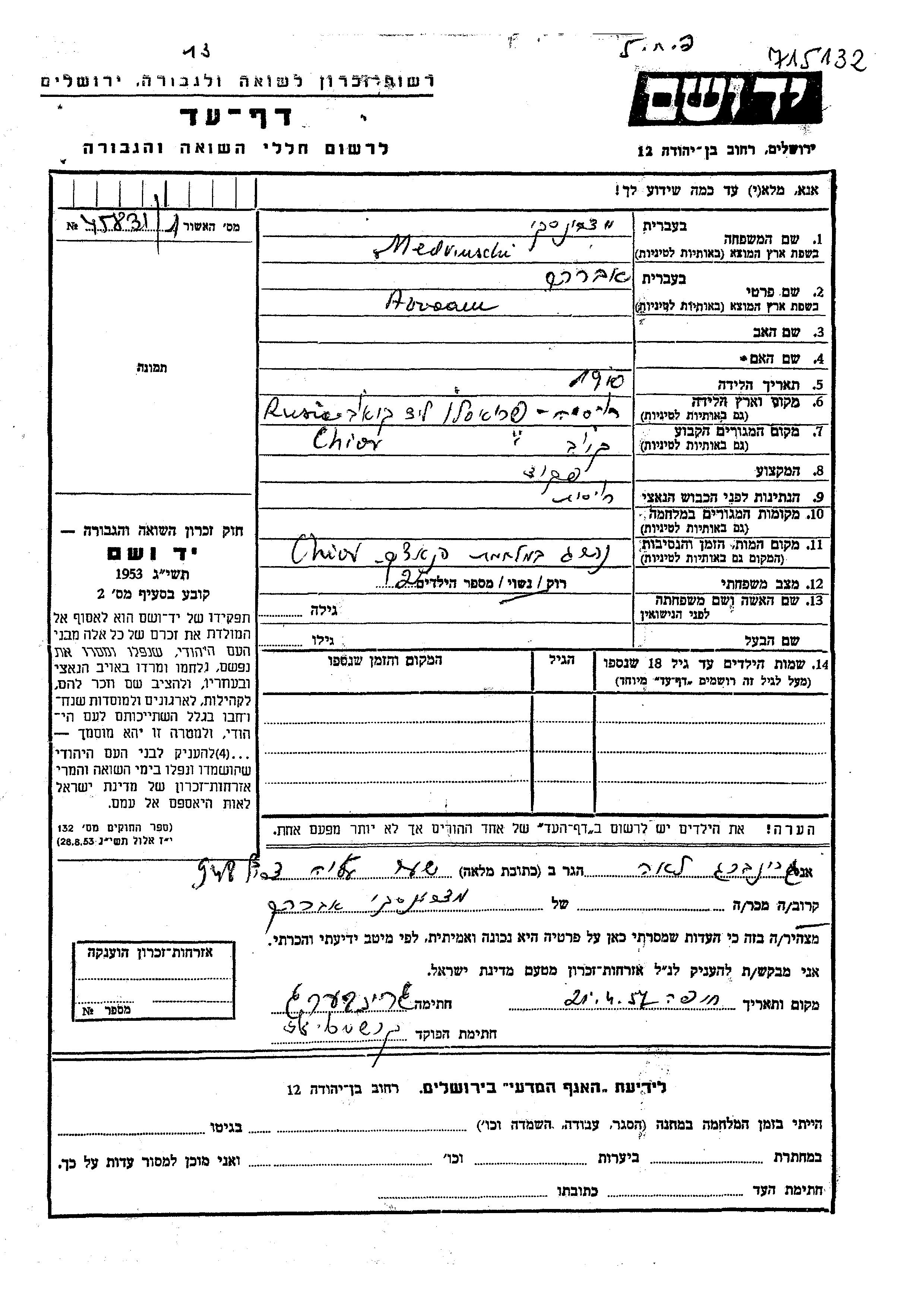 Abraam Medvinscki was born in Pereyaslav, Ukraine (USSR), 1910. He was a clerk and married. Prior to WWII he lived in Kiev, Ukraine (USSR). Abraam was murdered in the Shoah. Place of death: Kiev, Ukraine (USSR).