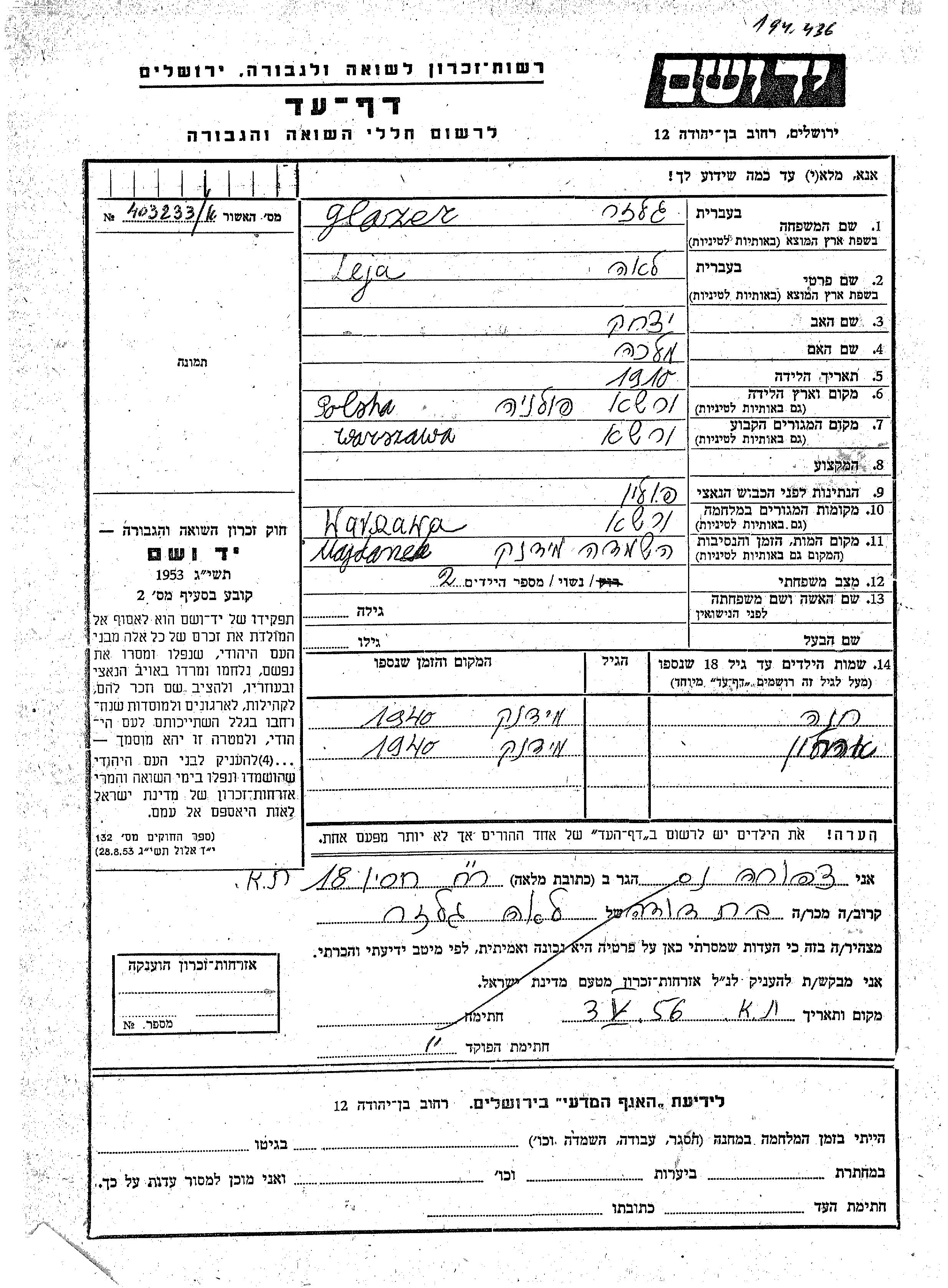 Glazer Khana Warszawa, Poland Page of Testimony