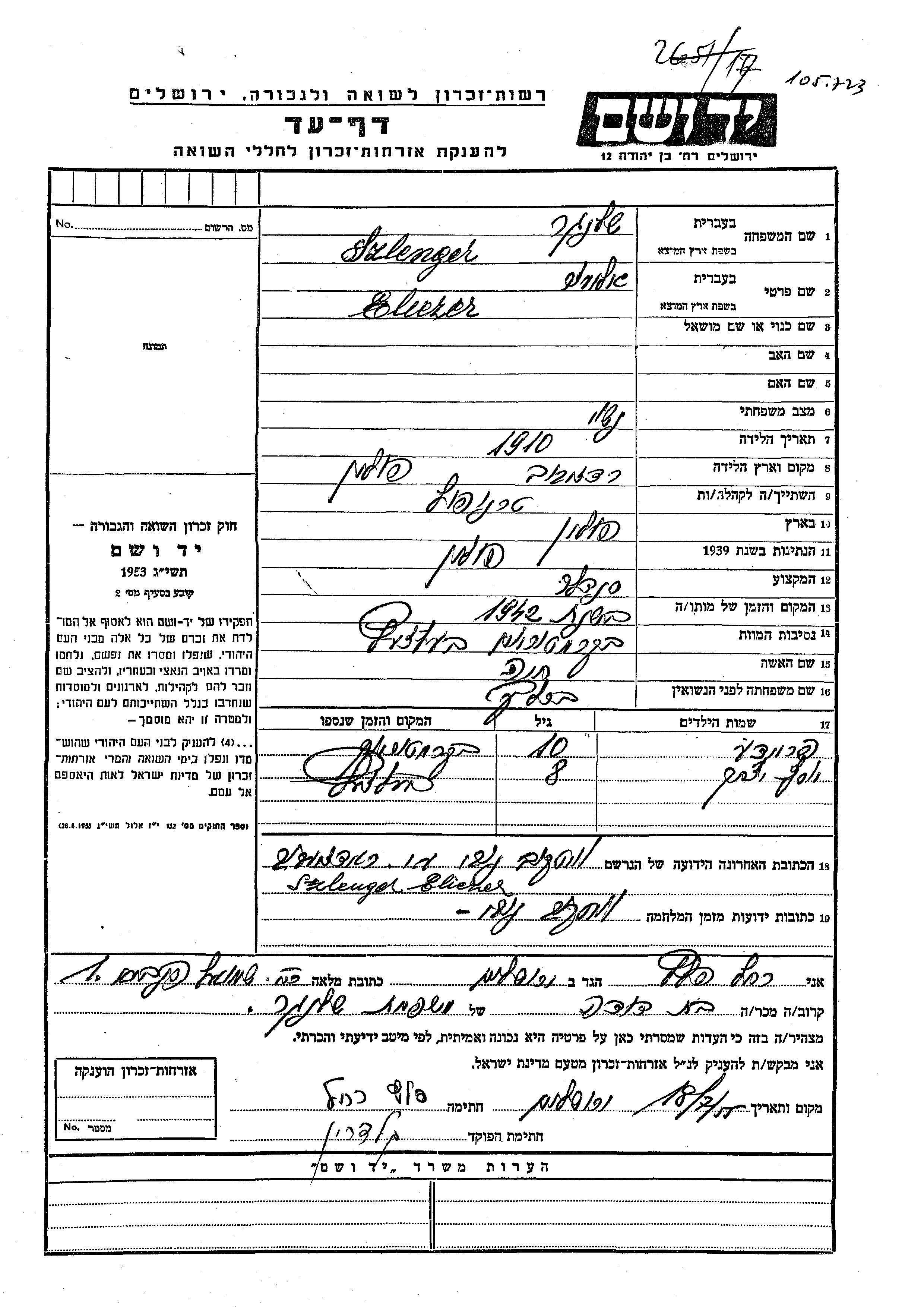 Yad Vashem - Pages of Testimony Names Memorial Collection