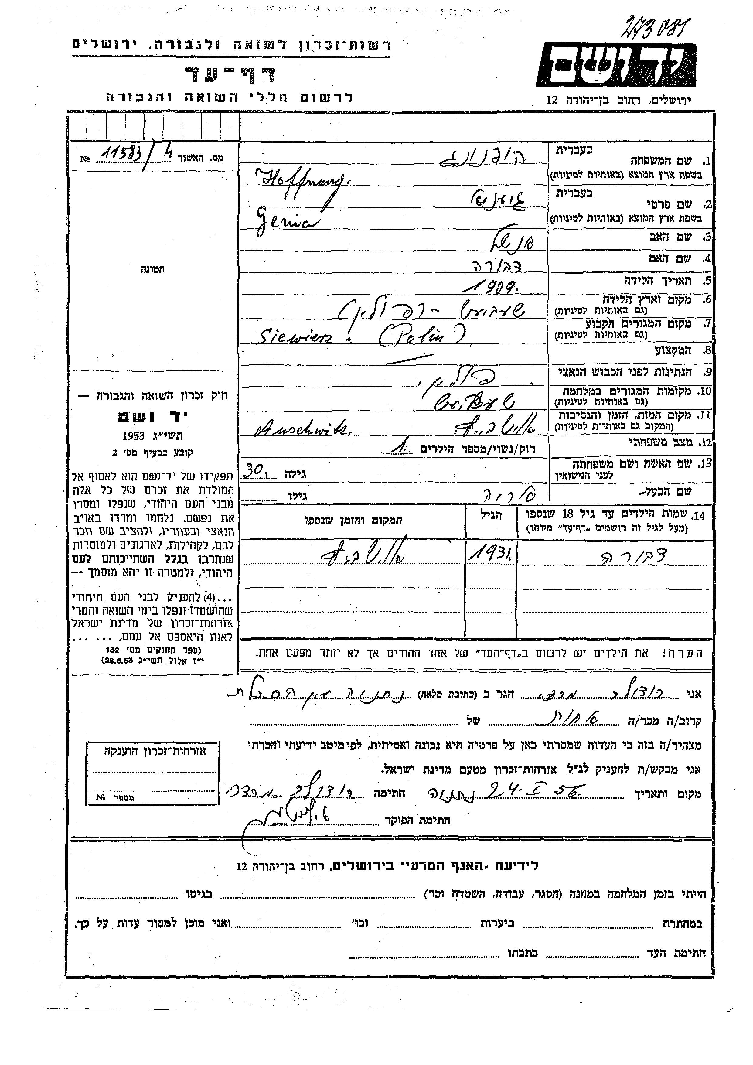 Genia Giena Hoffnang was born in Siewierz, Poland, 1909 to Anshel and Dvora. She was married to Arie. Prior to WWII she lived in Siewierz, Poland. During the war she was in Siewierz, Poland. Genia Giena was murdered in the Shoah. Place of death: Oświęcim, Poland.