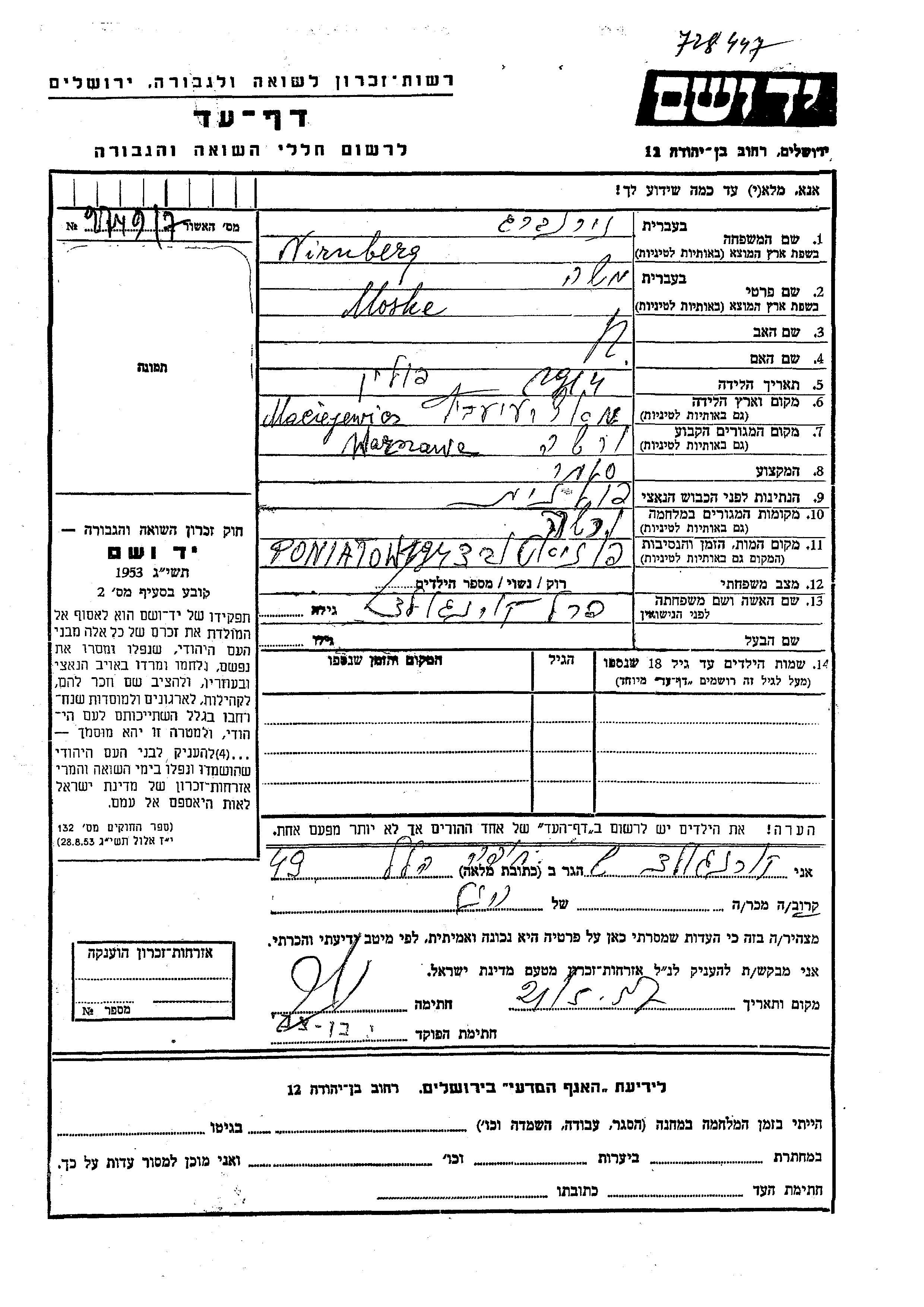 Moshe Nirnberg was born in Maciejowice, Poland, 1914. He was a merchant and married to Perel nee Korngold. Prior to WWII he lived in Warszawa, Poland. During the war he was in Warszawa, Poland. Moshe was murdered in the Shoah. Place of death: Poniatow, Poland, 1943.