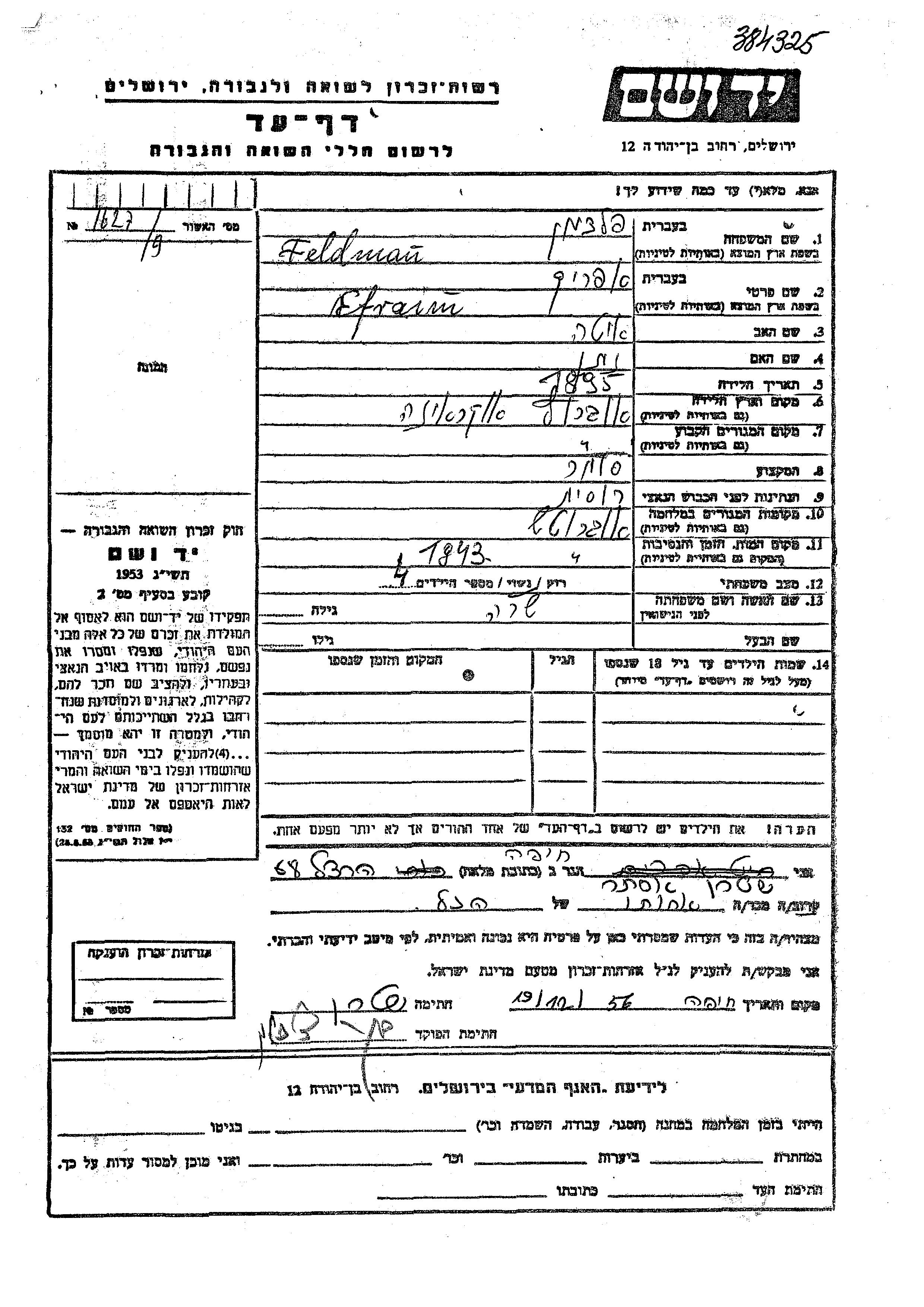 Feldman Efraim 1895 Ovruch, Ukraine (USSR) Page of Testimony