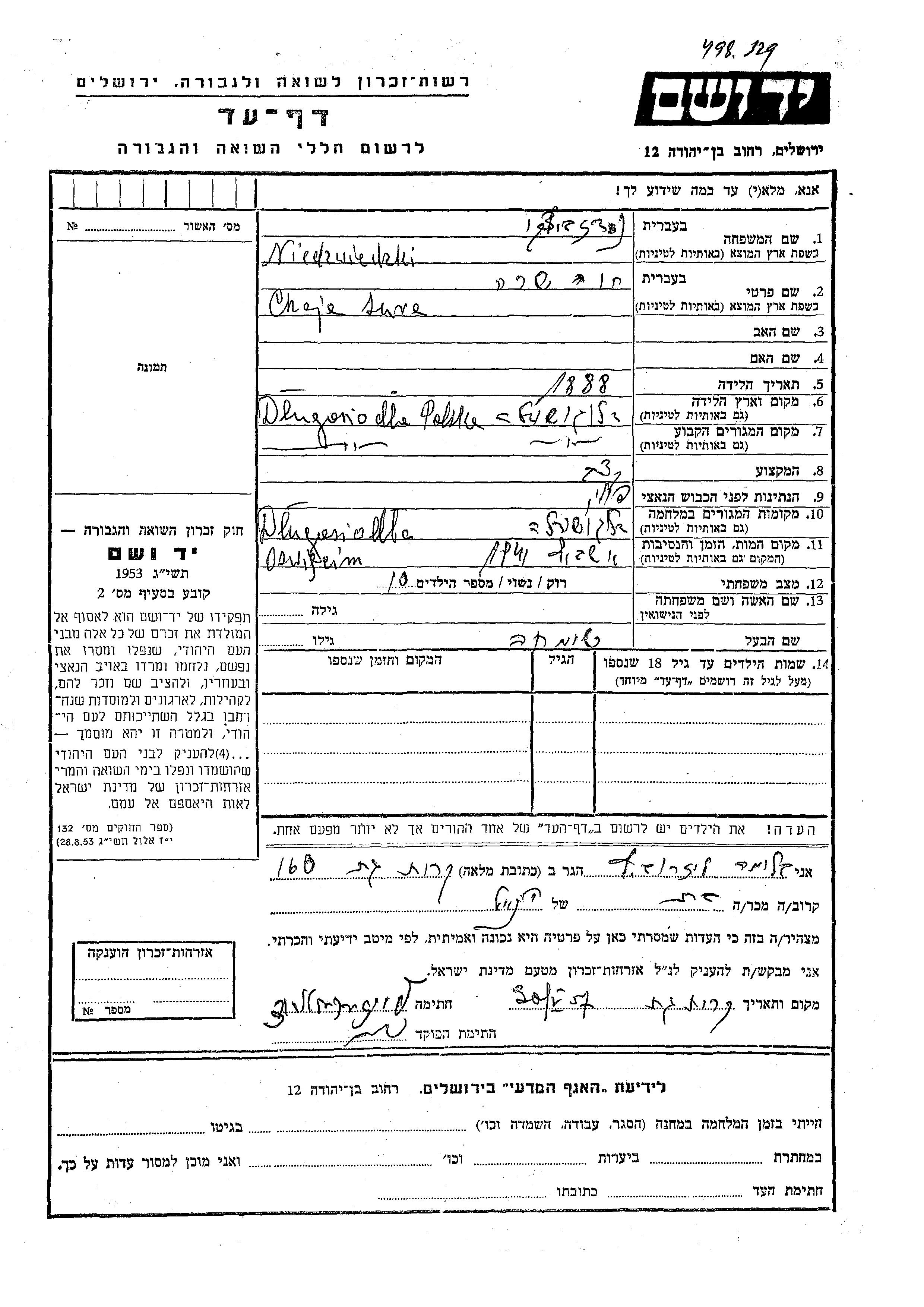 Chaja Sara Niedzwiedzki was born in Dlugosiodlo, Poland, 1888. She was a butcher and married to Simcha. Prior to WWII she lived in Dlugosiodlo, Poland. During the war she was in Dlugosiodlo, Poland. Chaja Sara was murdered in the Shoah. Place of death: Auschwitz, Poland, 1941.