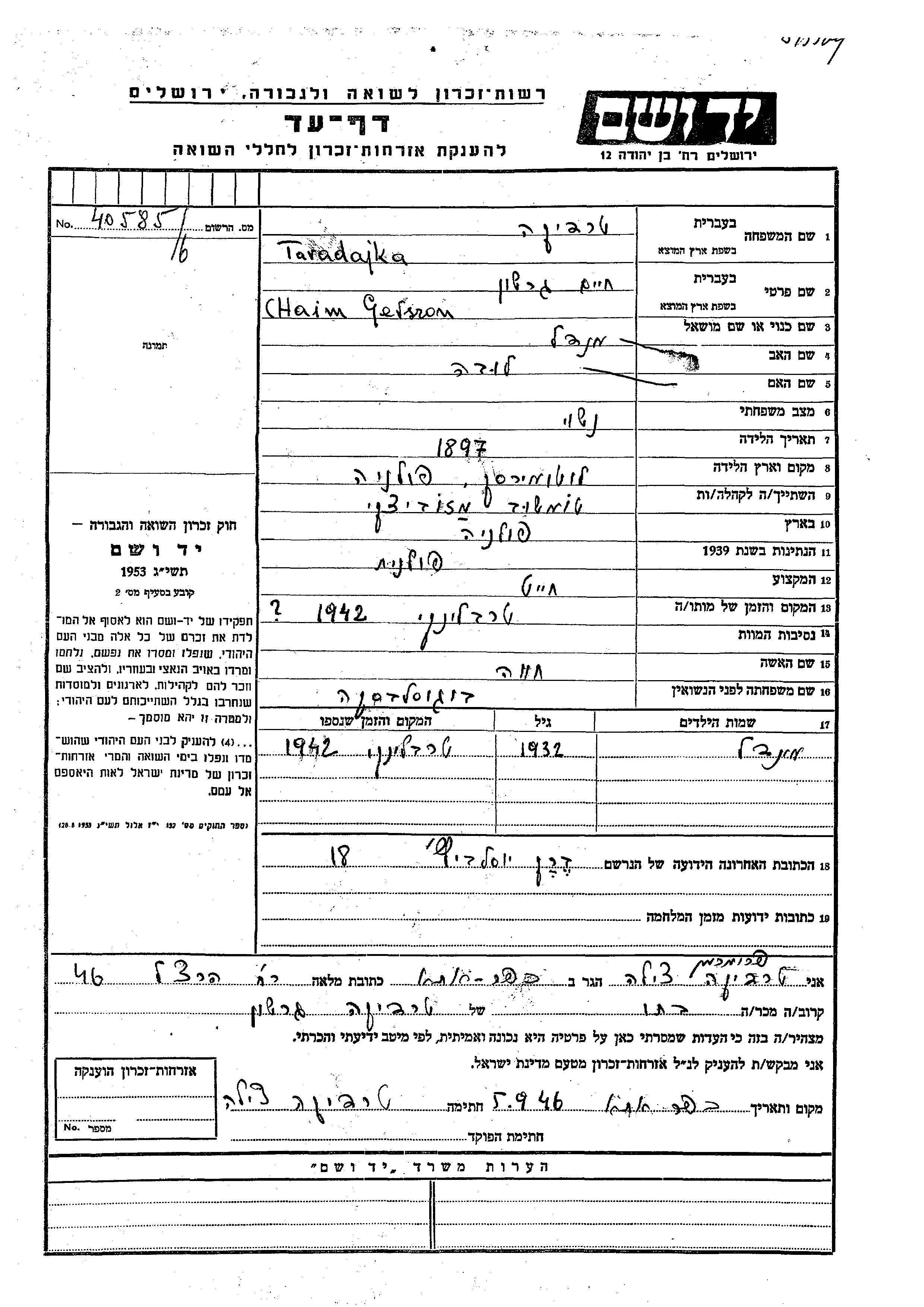 Chaim Gerszon Taradajka was born in Lutomiersk, Poland, 1897 to Mendel and Luba. He was a tailor and married to Khava nee Boguslavska. Chaim Gerszon was murdered in the Shoah. Place of death: Treblinka, Poland, 1942.