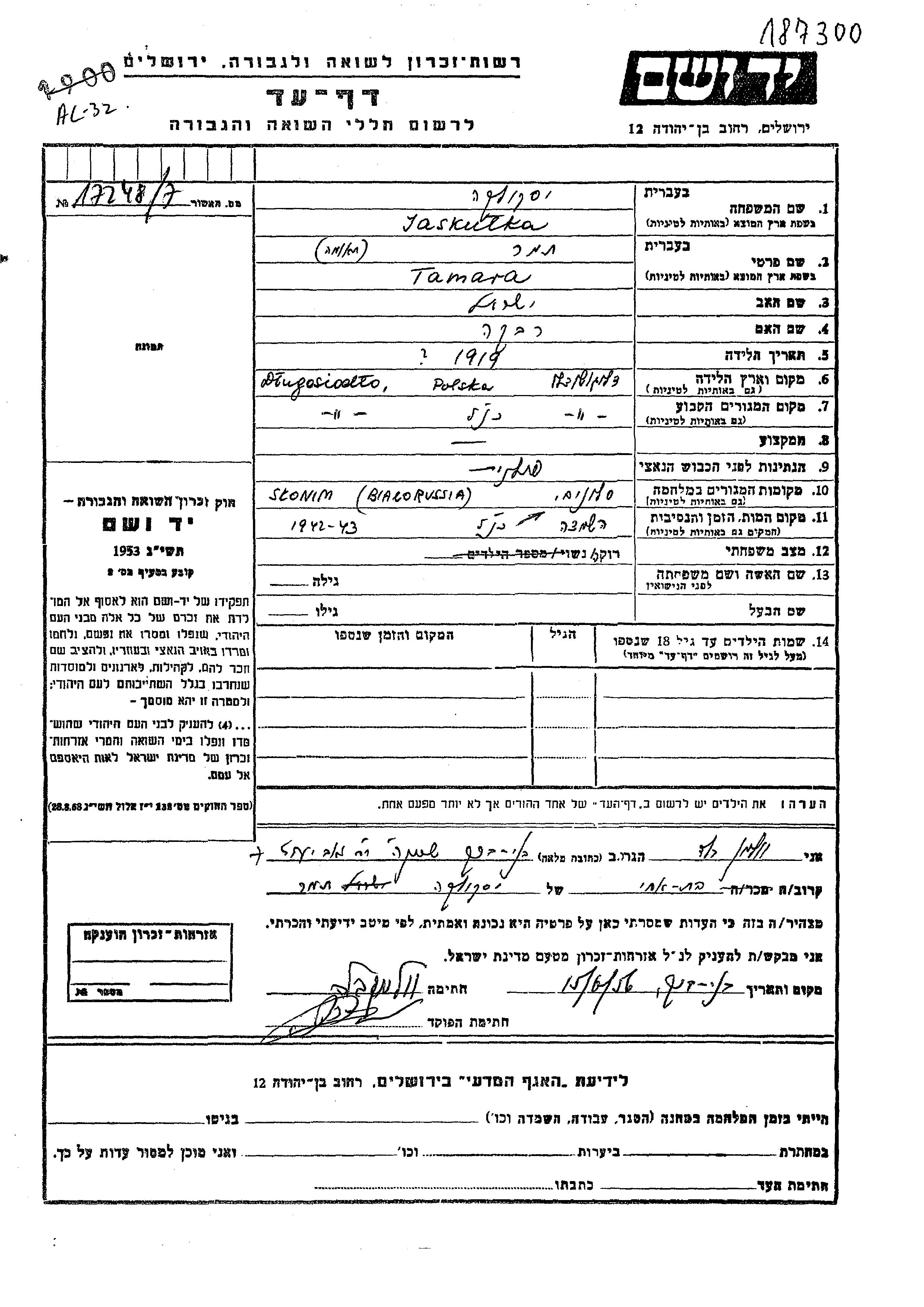 Tamara Jaskulka was born in Dlugosiodlo, Poland, 1919 to Yisrael and Rivka. She was single. Prior to WWII she lived in Dlugosiodlo, Poland. During the war she was in Slonim, Poland. Tamara was murdered in the Shoah. Place of death: Slonim, Poland, 1942.