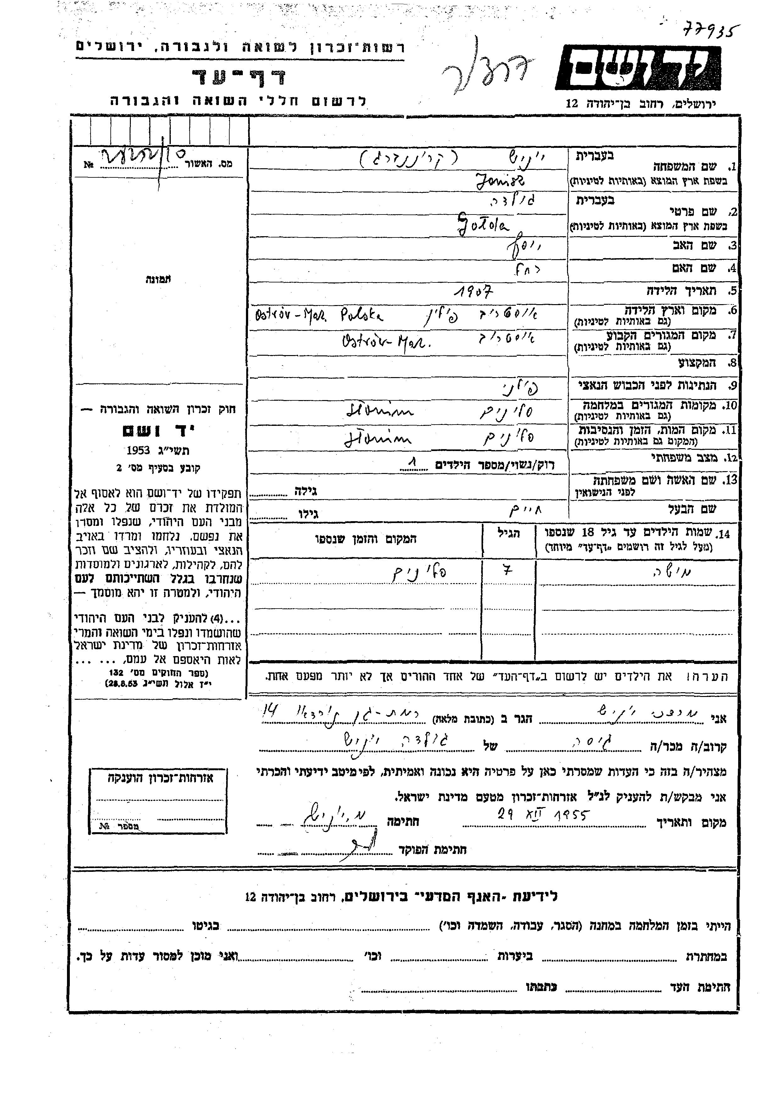 Jonisz Golda 1907 Ostrow Mazowiecki, Poland Page of Testimony