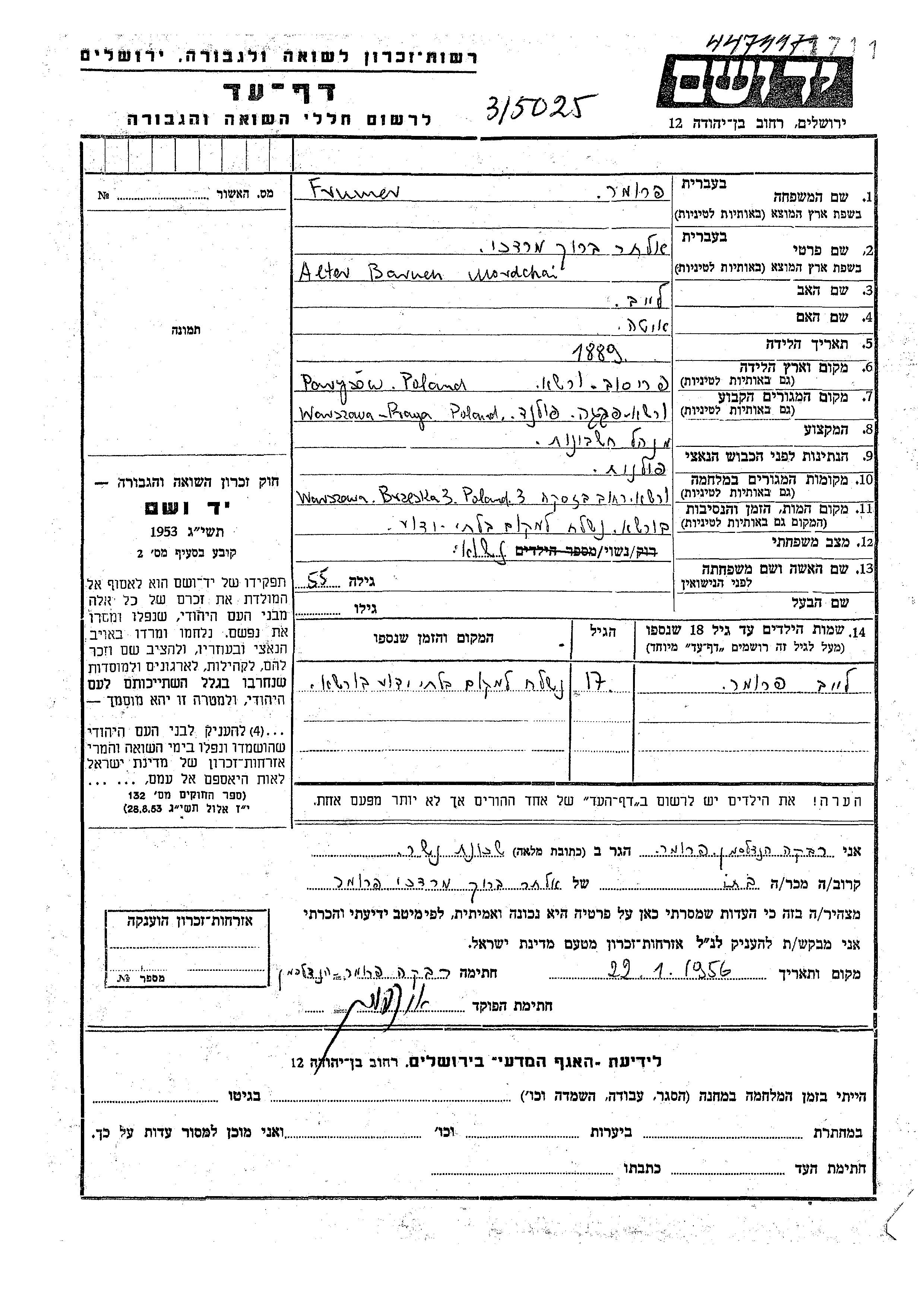 Baruch Mordchai Alter Frumer was born in Parysow, Poland, 1889 to Leib and Ita. He was a bookkeeper and married. Prior to WWII he lived in Praga Warszawa, Poland. During the war he was in Warsaw, Poland. Baruch Mordchai Alter was murdered in the Shoah. Place of death: Warsaw, Poland.