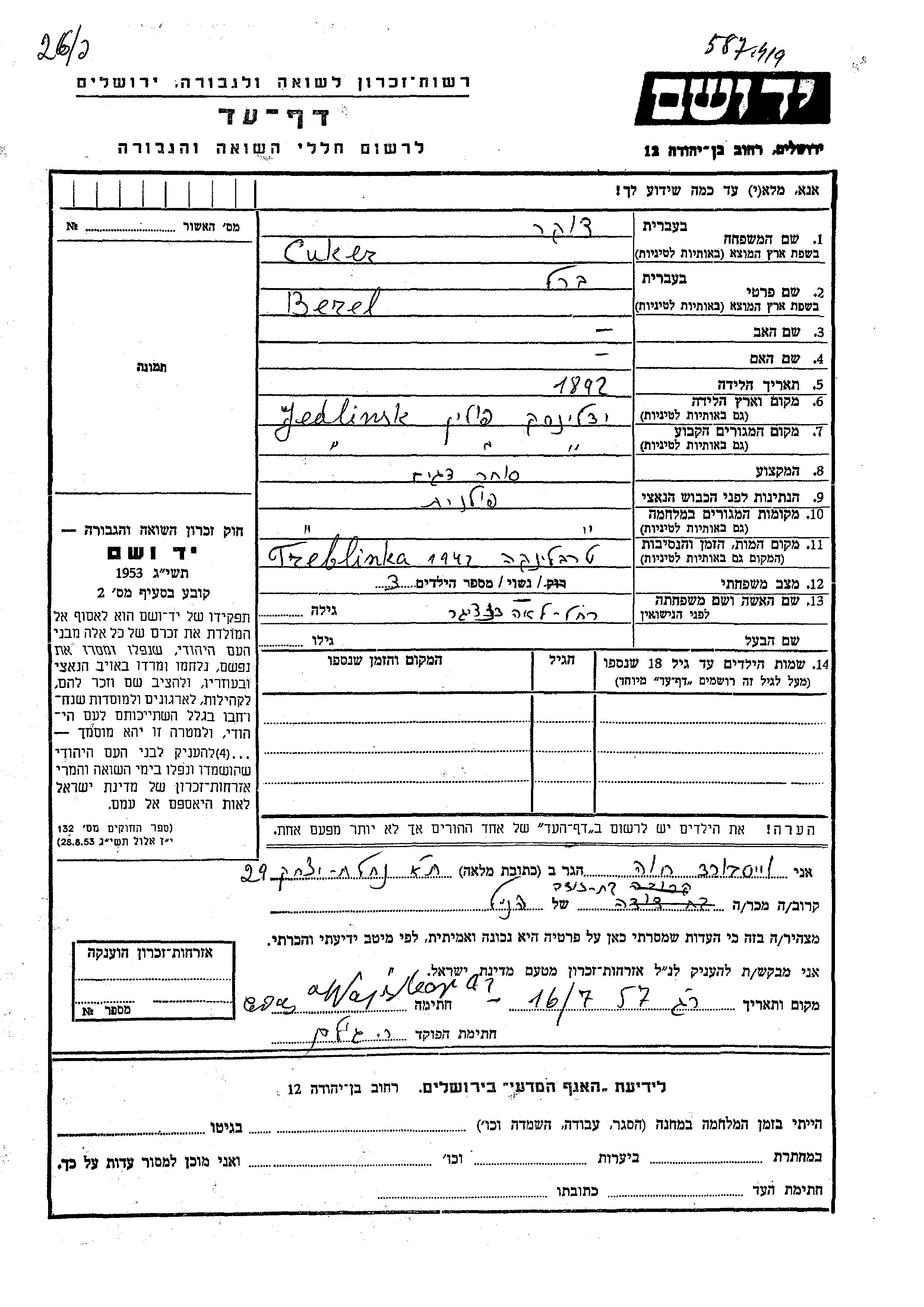 Berl Cuker was born in Jedlinsk, Poland, 1892. He was a fishmonger and married to Rakhel Lea nee Danziger. Prior to WWII he lived in Jedlinsk, Poland. During the war he was in Jedlinsk, Poland. Berl was murdered in the Shoah. Place of death: Treblinka, Poland, 1942.