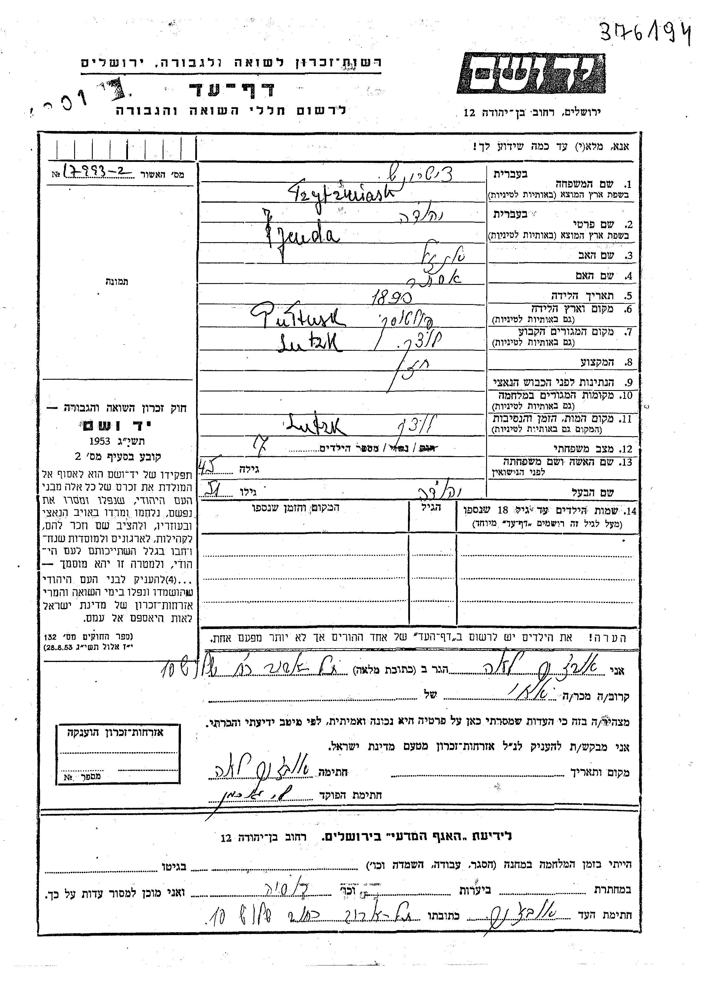 Jeuda Tzytriniash was born in Pultusk, Poland, 1890 to Enzel and Ester. He was a cantor and married. Prior to WWII he lived in Lutzk, Poland. Jeuda was murdered in the Shoah. Place of death: Lutzk, Poland.