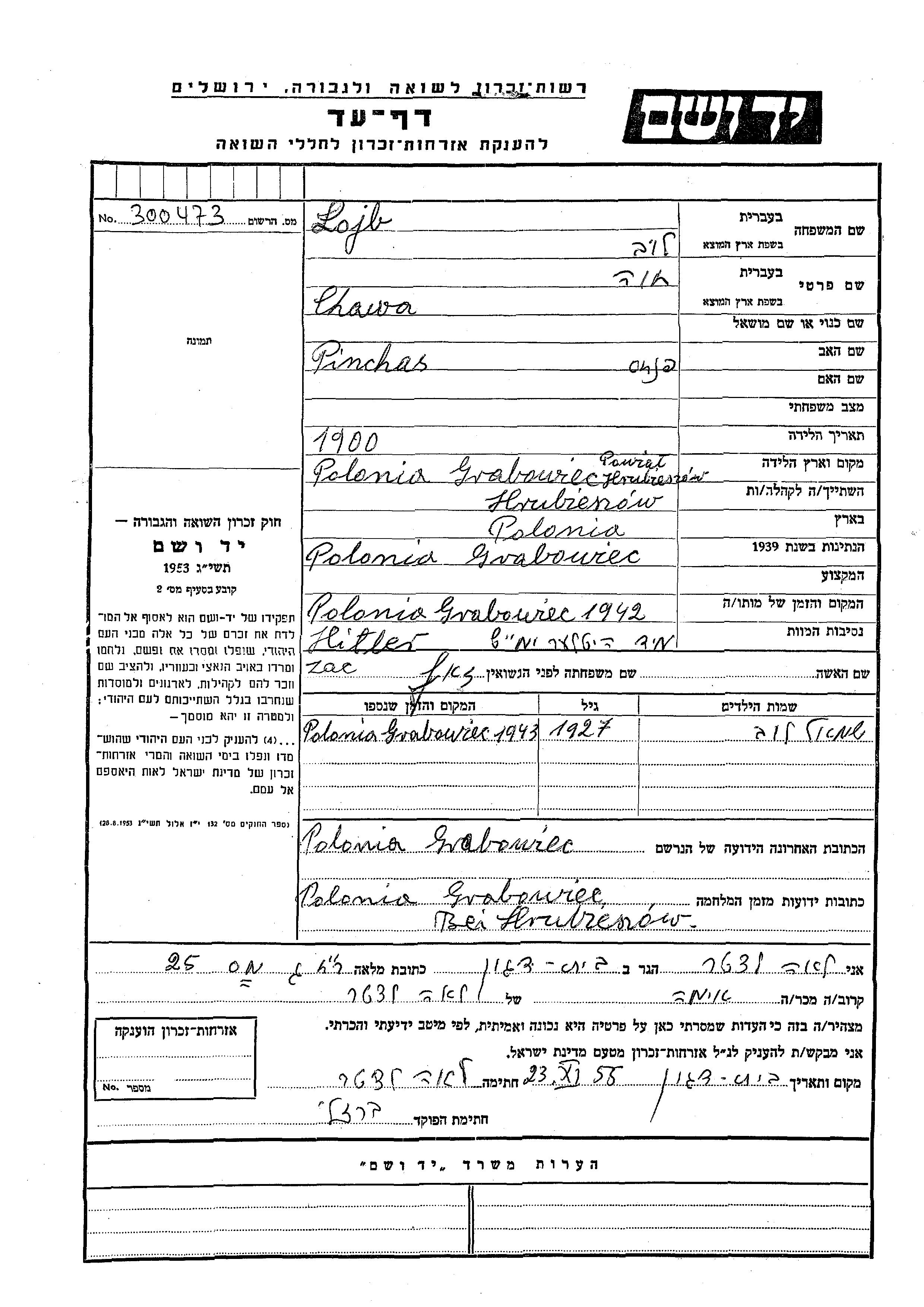 Chawa Lojb nee Zac was born in Grabowiec, Poland, 1900 to Pinchas. Prior to WWII she lived in Poland. During the war she was in Grabowiec, Poland. Chawa was murdered in the Shoah. Place of death: Grabowiec, Poland, 1942.