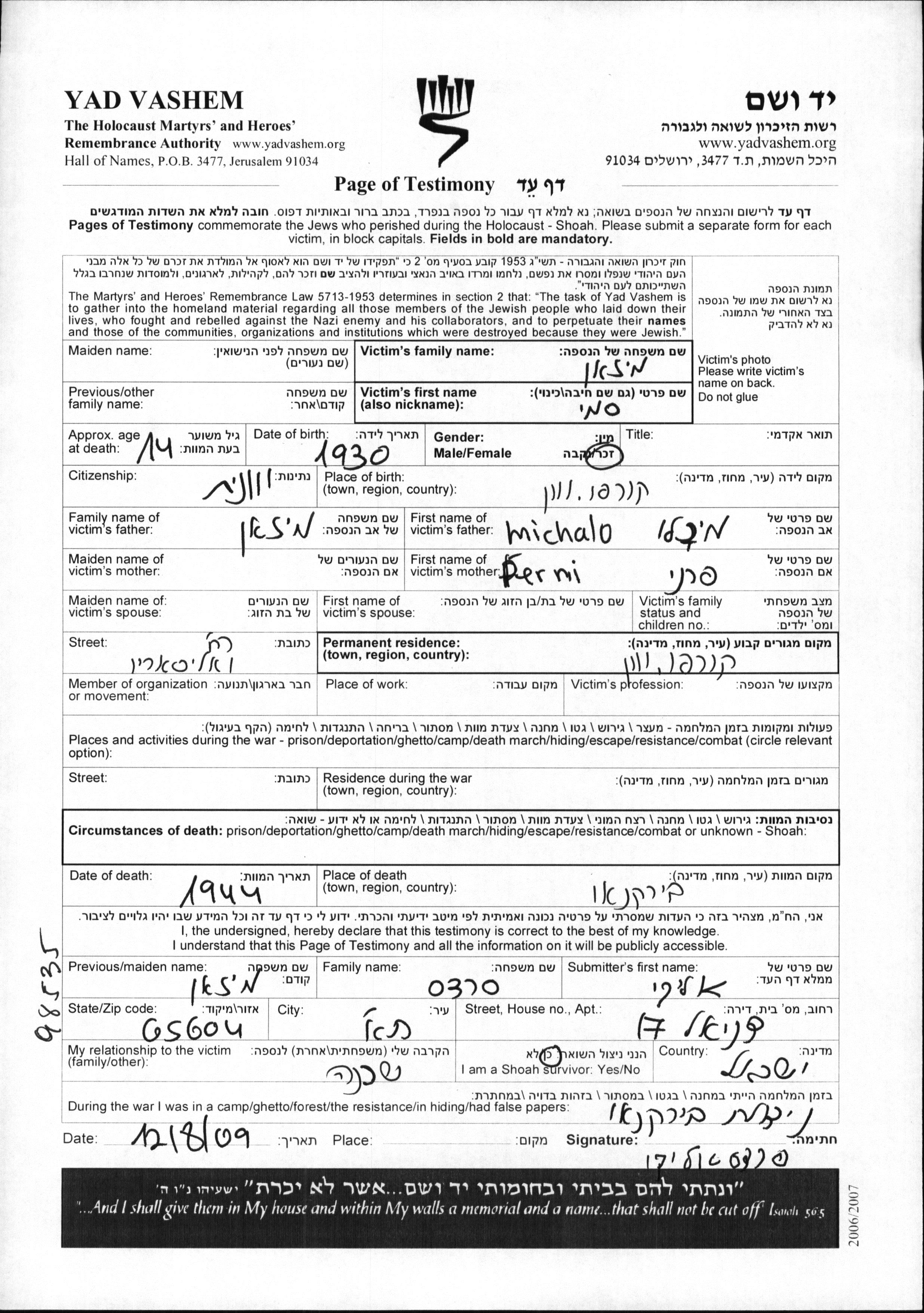 Yad Vashem - Pages of Testimony Names Memorial Collection