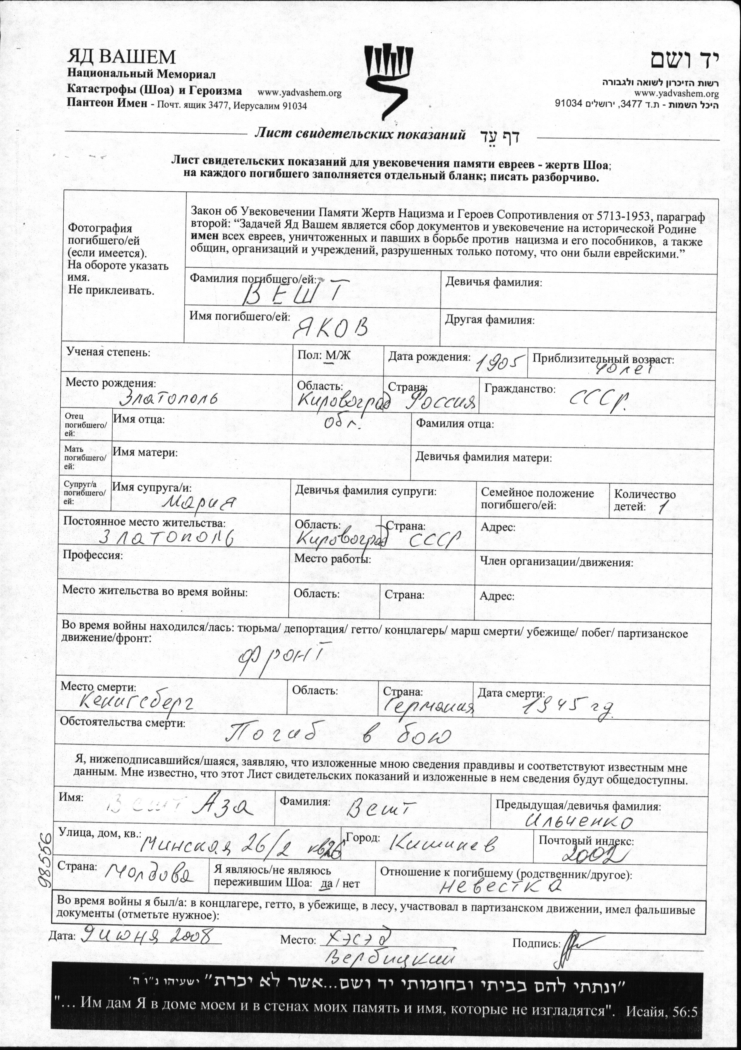 Yakov Vesht was born in Zlatopol, Ukraine (USSR), 1905. He was married to Mariya. Prior to WWII he lived in Zlatopol, Ukraine (USSR). During the war he was in the Soviet armed forces. Yakov was killed in military service in WWII. Place of death: Koenigsberg, Germany, 1945.