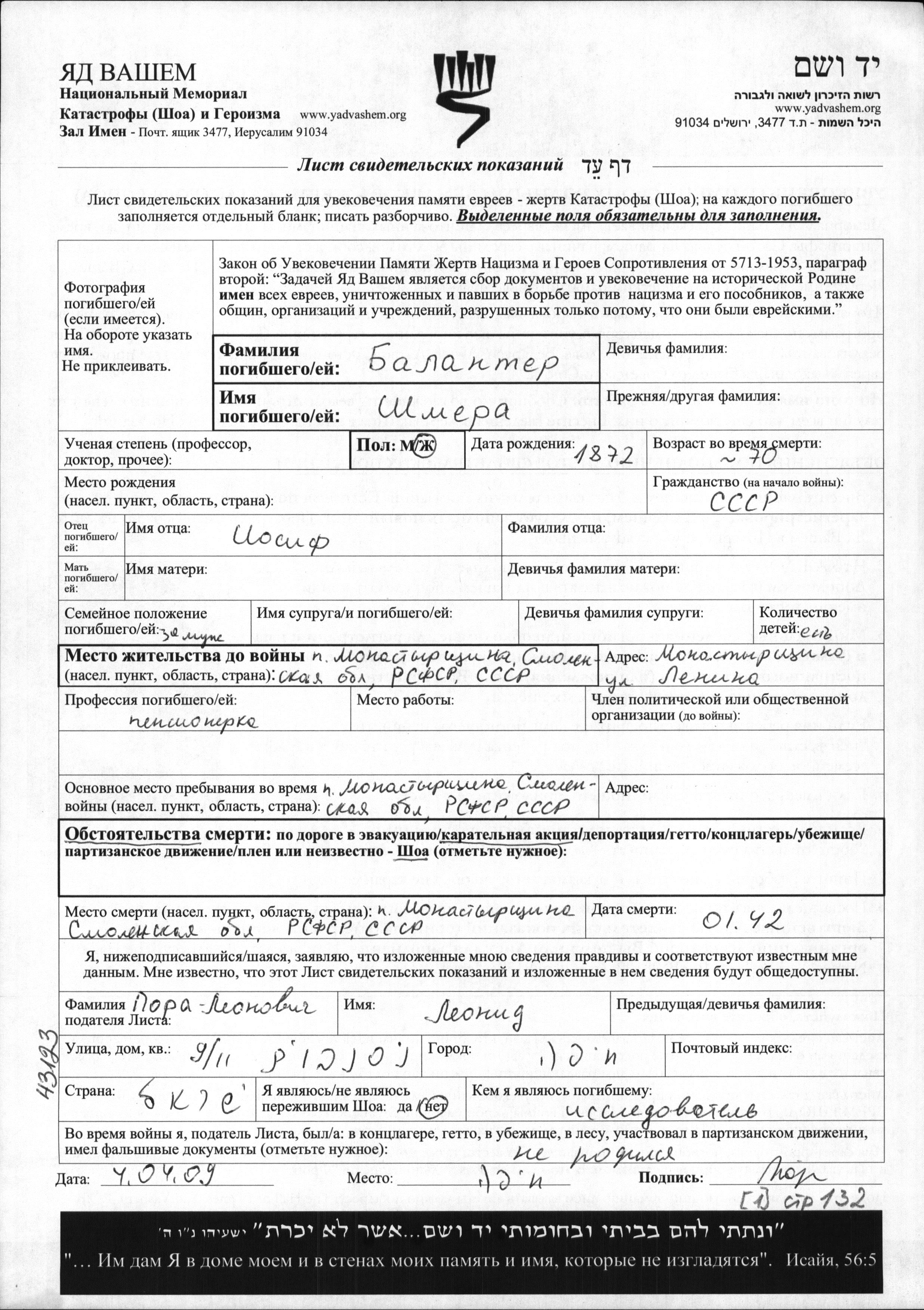 Shmera Balanter was born, 1872 to Iosif. She was a pensioner and married. Prior to WWII she lived in Monastyrshchina, Russia (USSR). During the war she was in Monastyrshchina, Russia (USSR). Shmera was murdered in the Shoah. Place of death: Monastyrshchina, Russia (USSR), 01/1942.
