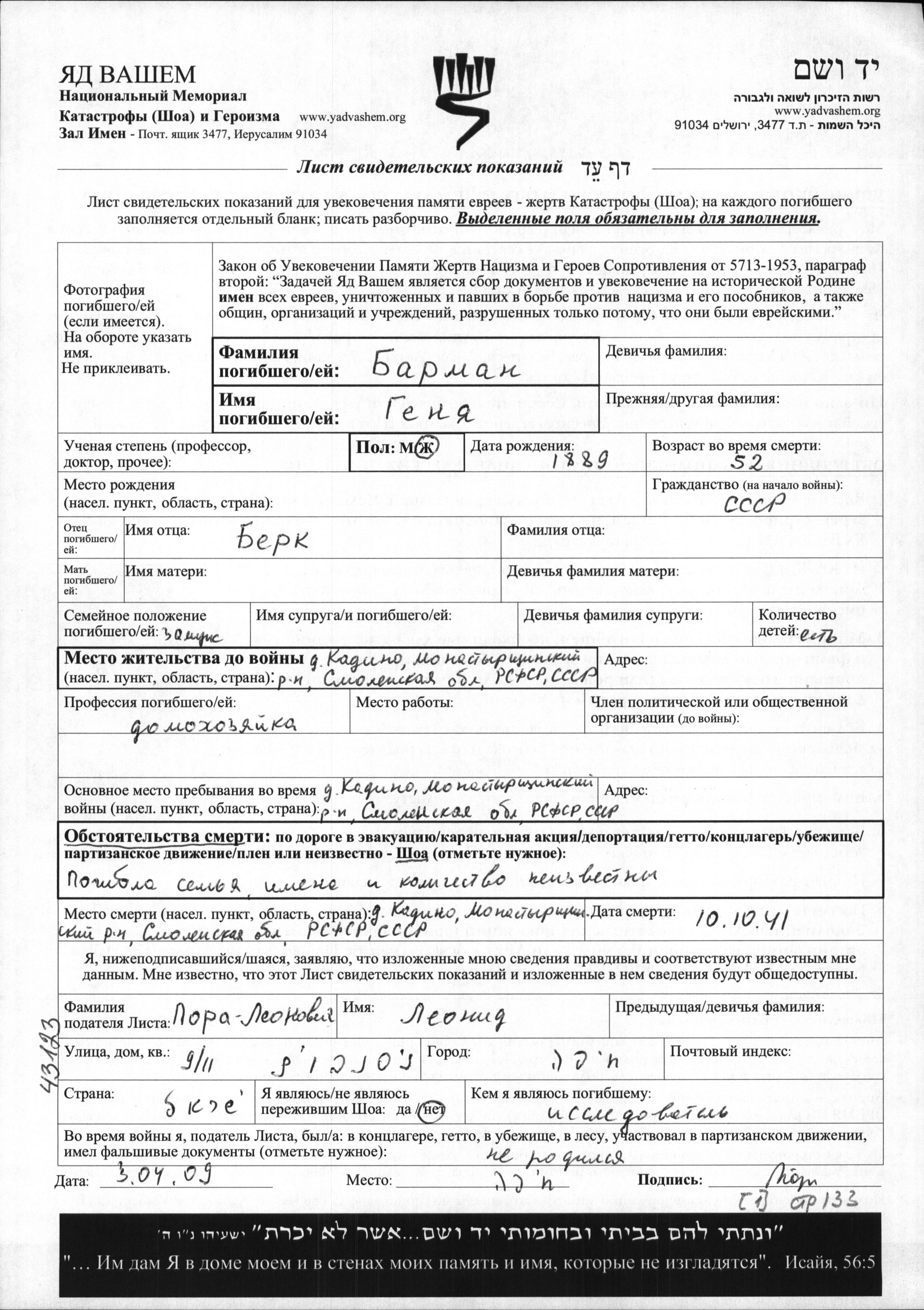 Genya Barman was born, 1889 to Berk. She was a housewife and married. Prior to WWII she lived in Kadino, Russia (USSR). During the war she was in Kadino, Russia (USSR).