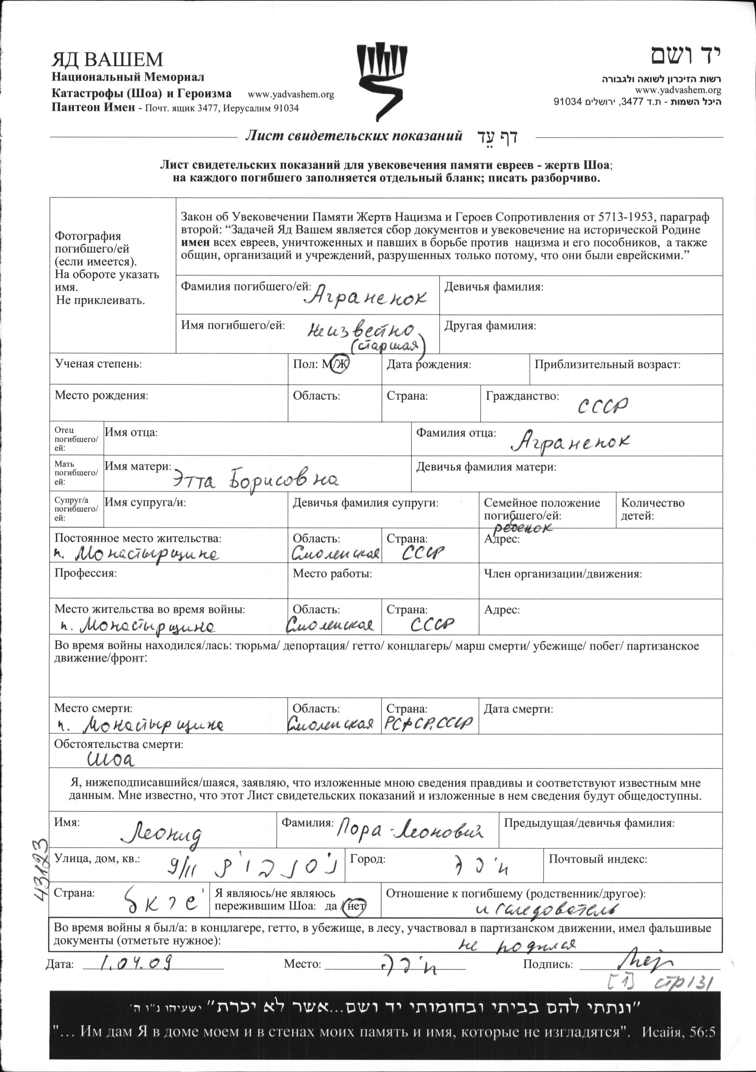 First name unknown Agranyonok was born to Etta. She was child. Prior to WWII she lived in Monastyrshchina, Russia (USSR). During the war she was in Monastyrshchina, Russia (USSR). She was murdered in the Shoah. Place of death: Monastyrshchina, Russia (USSR).