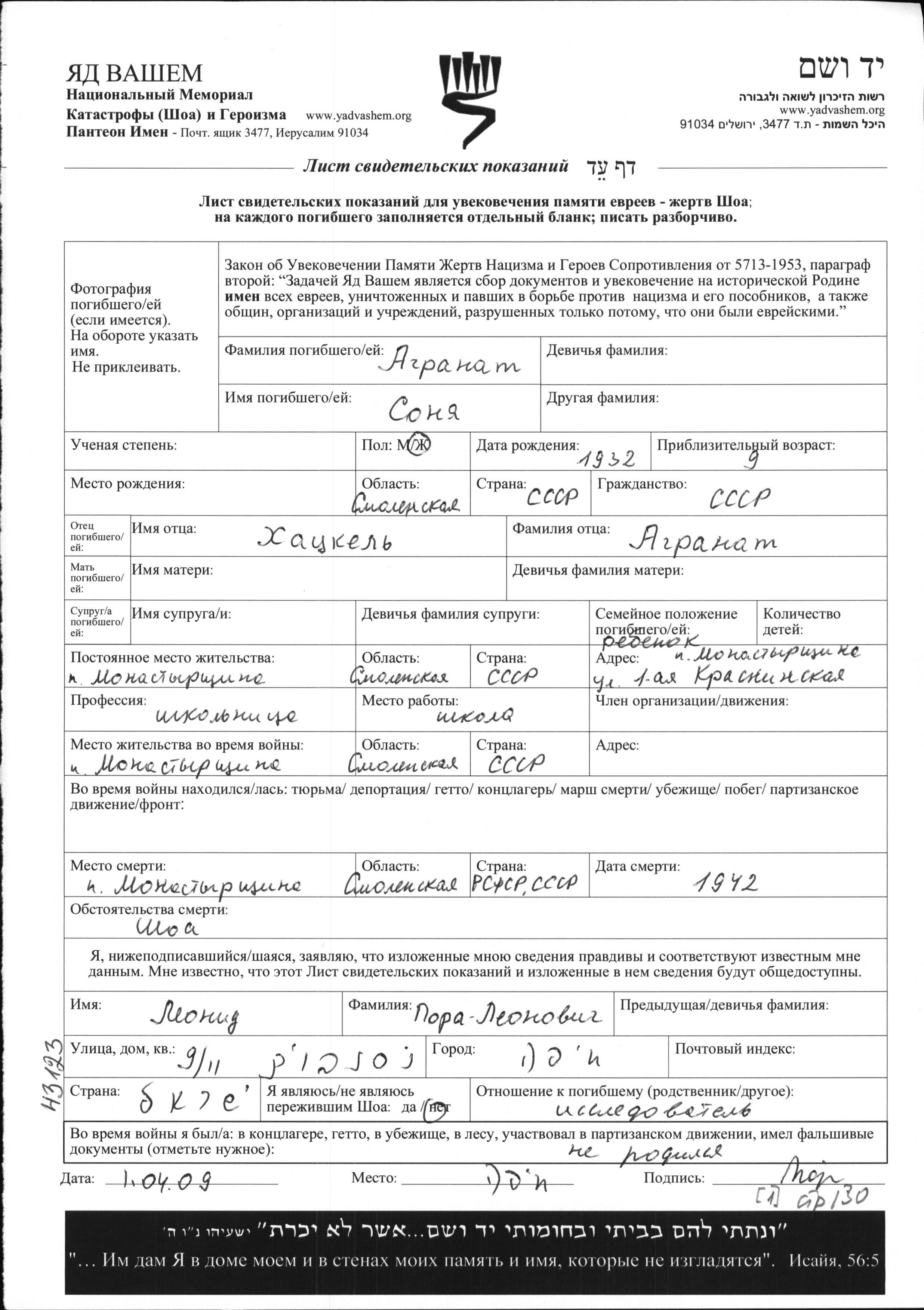 Sonya Agranat was born in Smolensk, Russia (USSR), 1932 to Khatzkel. She was a schoolgirl and child. Prior to WWII she lived in Monastyrshchina, Russia (USSR). During the war she was in Monastyrshchina, Russia (USSR). Sonya was murdered in the Shoah. Place of death: Monastyrshchina, Russia (USSR), 1942.