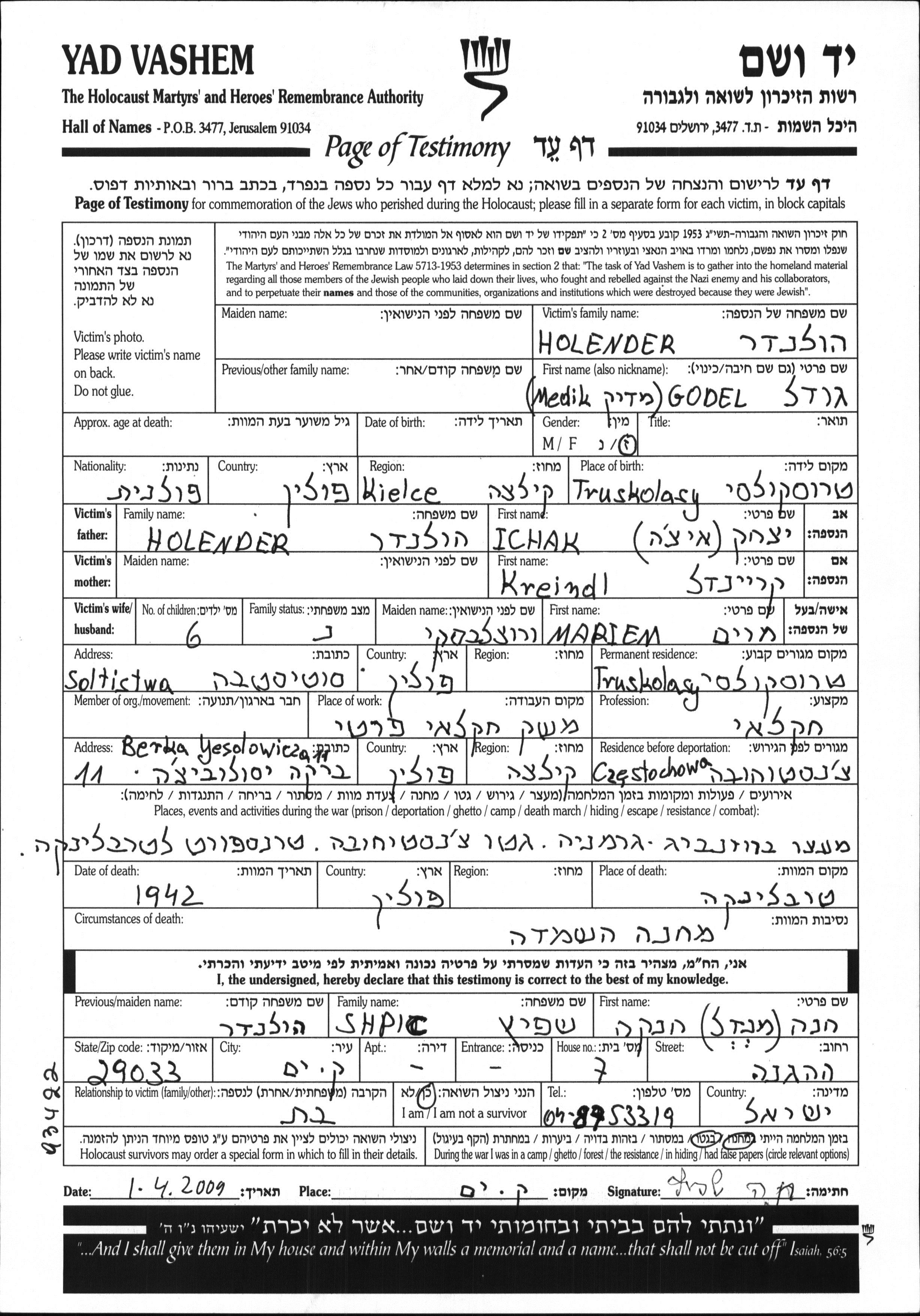 Godel Medik Holender was born in Truskolasy, Poland to Ichak and Kreindl. He was an agriculturist and married to Mariem nee Vrotzlavski. Prior to WWII he lived in Truskolasy, Poland. During the war he was in Czestochowa, Poland. Godel Medik was murdered in the Shoah. Place of death: Treblinka, Poland, 1942.