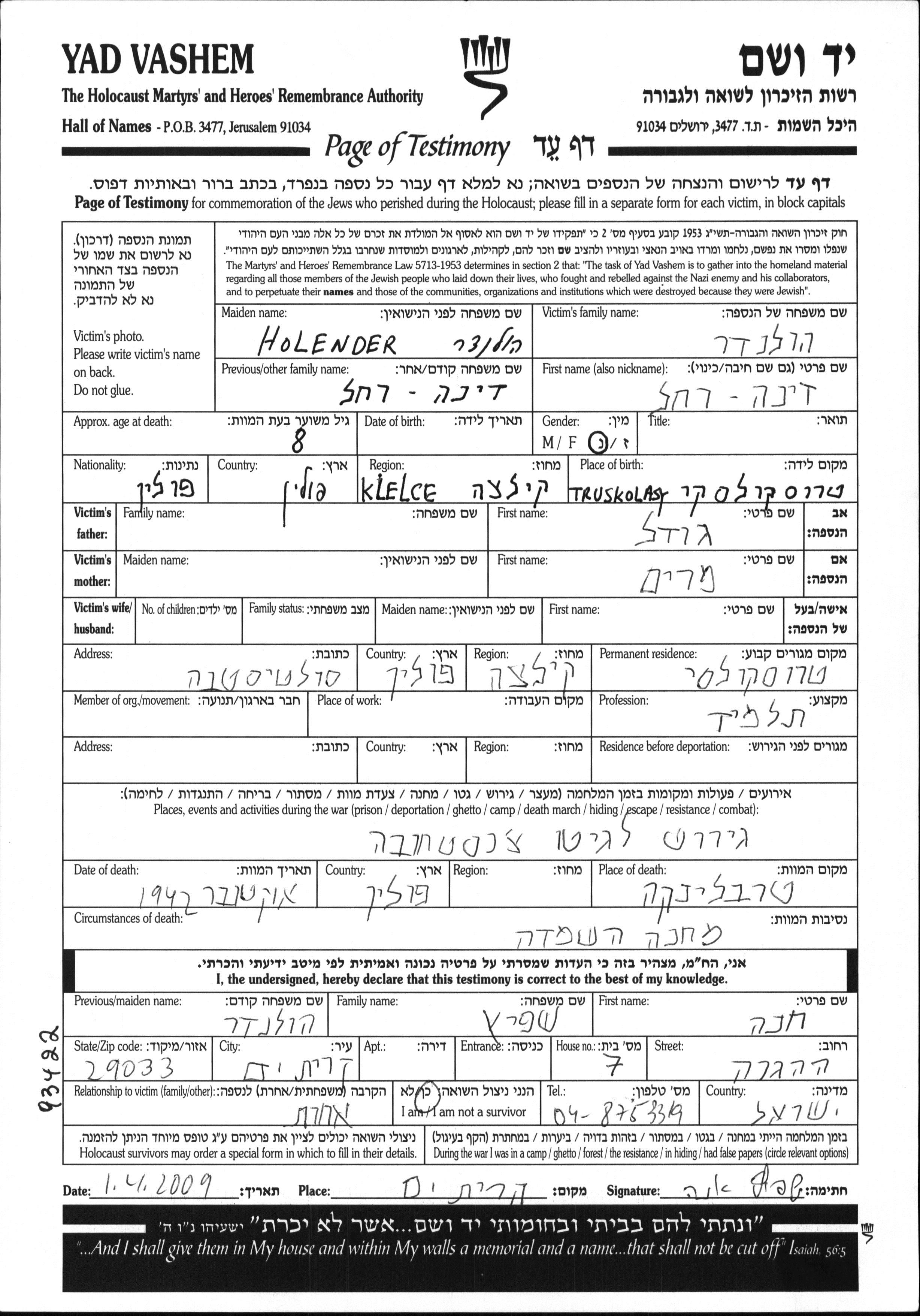 Dina Rachel Holender was born in Truskolasy, Poland to Godel and Miriam. She was a pupil and child. Prior to WWII she lived in Truskolasy, Poland. During the war she was in Czestochowa, Poland. Dina Rachel was murdered in the Shoah. Place of death: Treblinka, Poland, 10/1942.