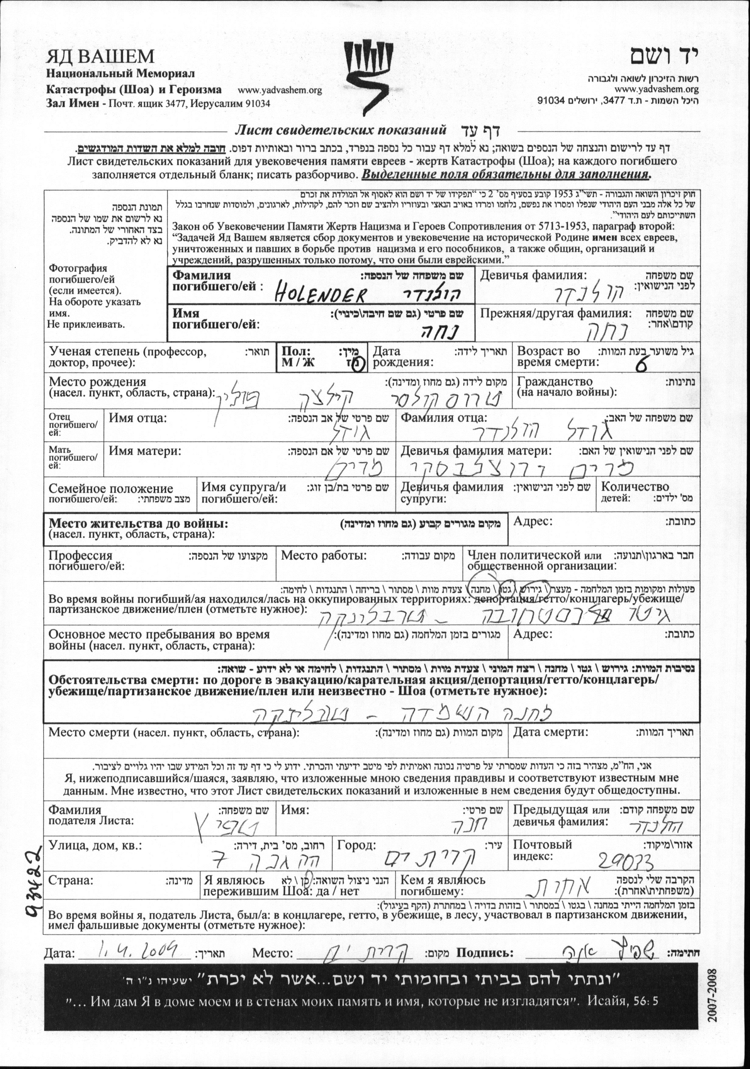 Nekha Holender was born in Truskolasy, Poland to Godel and Miriam nee Vrotzlavski. She was a child and child. Prior to WWII she lived in Truskolasy, Poland. During the war she was in Czestochowa, Poland. Nekha was murdered in the Shoah. Place of death: Treblinka, Poland.