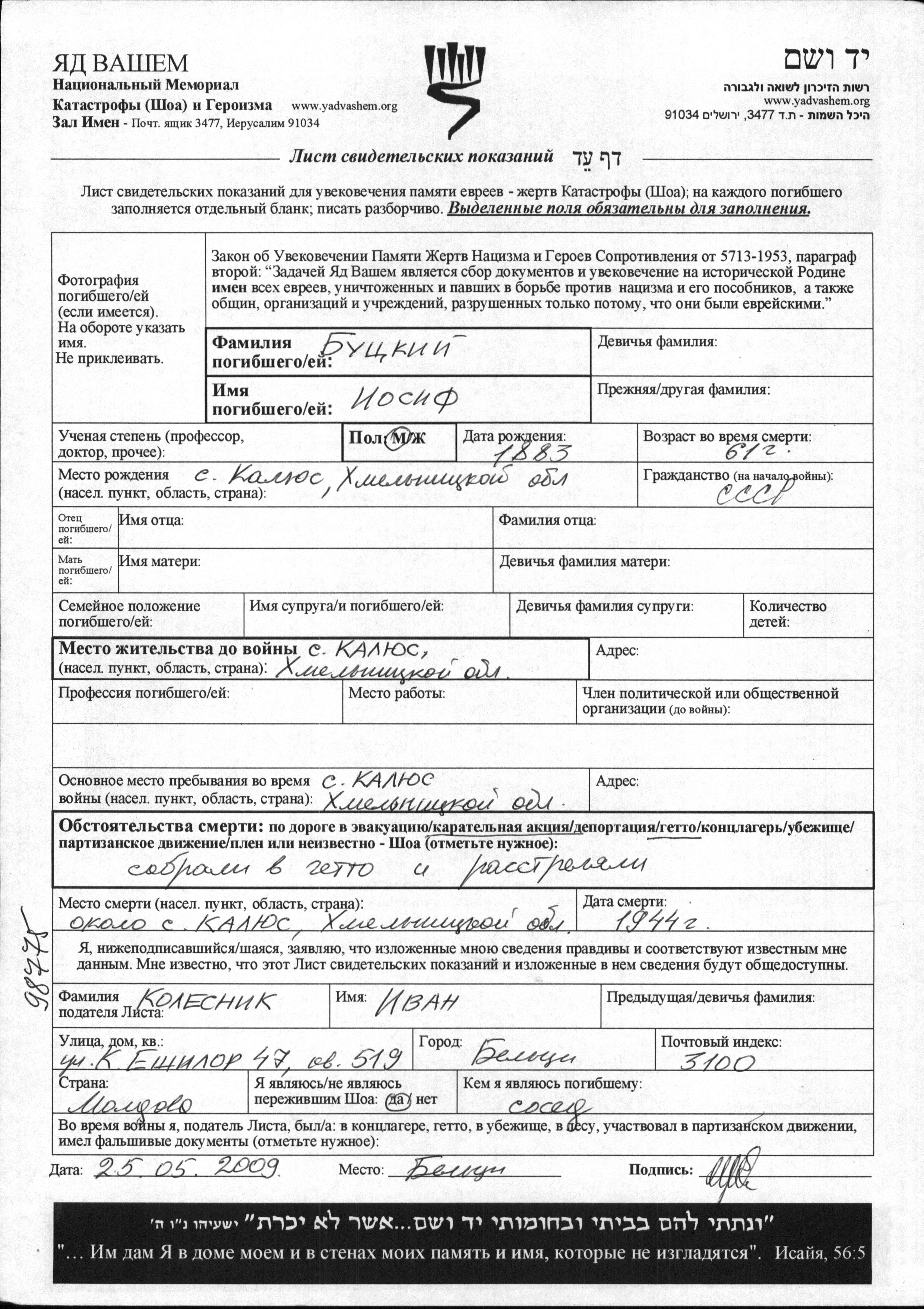 Iosif Butzki was born in Kalyus, Ukraine (USSR), 1883. Prior to WWII he lived in Kalyus, Ukraine (USSR). During the war he was in Ghetto. Iosif was murdered in the Shoah. Place of death: Kalyus, Ukraine (USSR), 1944.