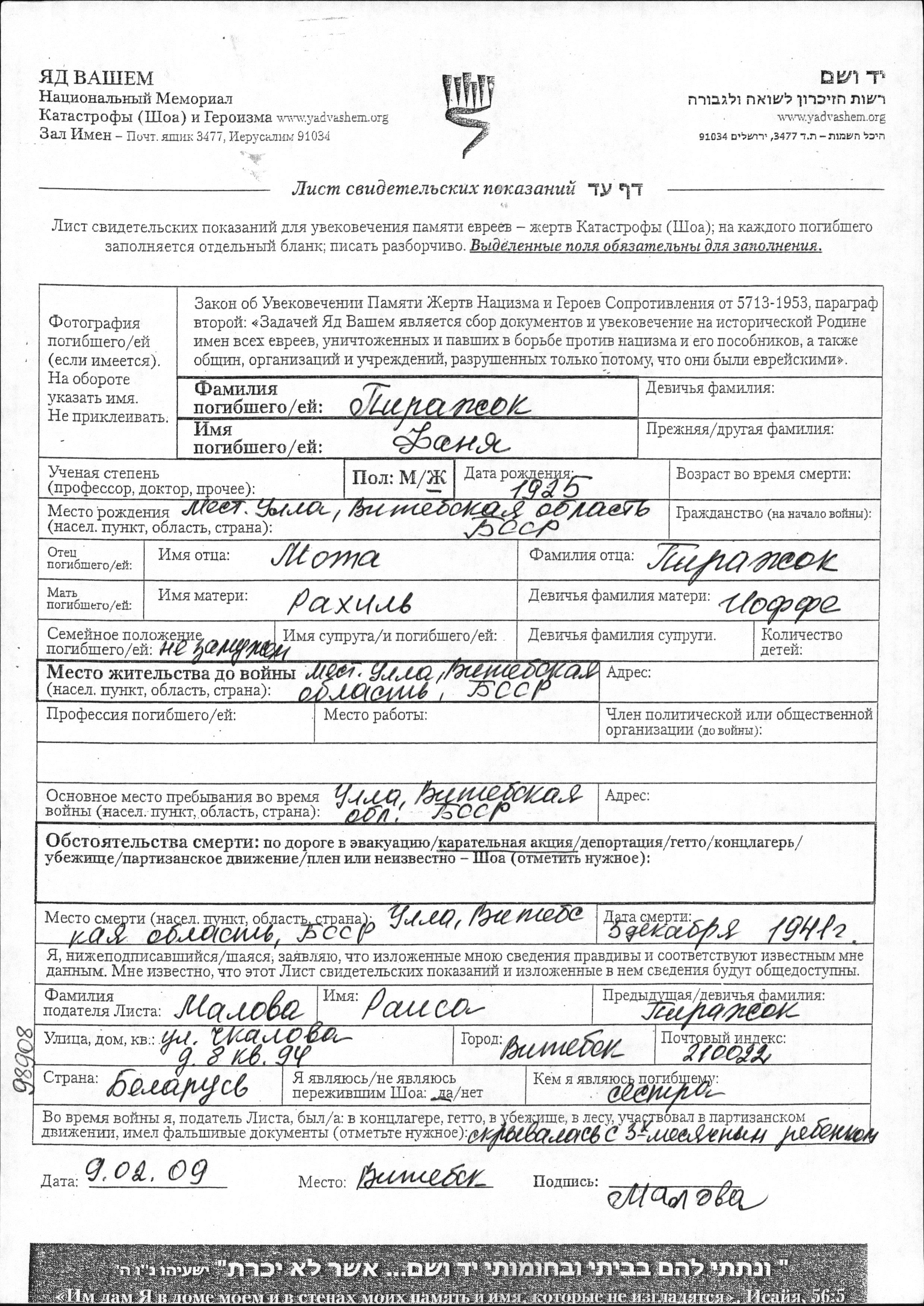 Yad Vashem - Pages of Testimony Names Memorial Collection