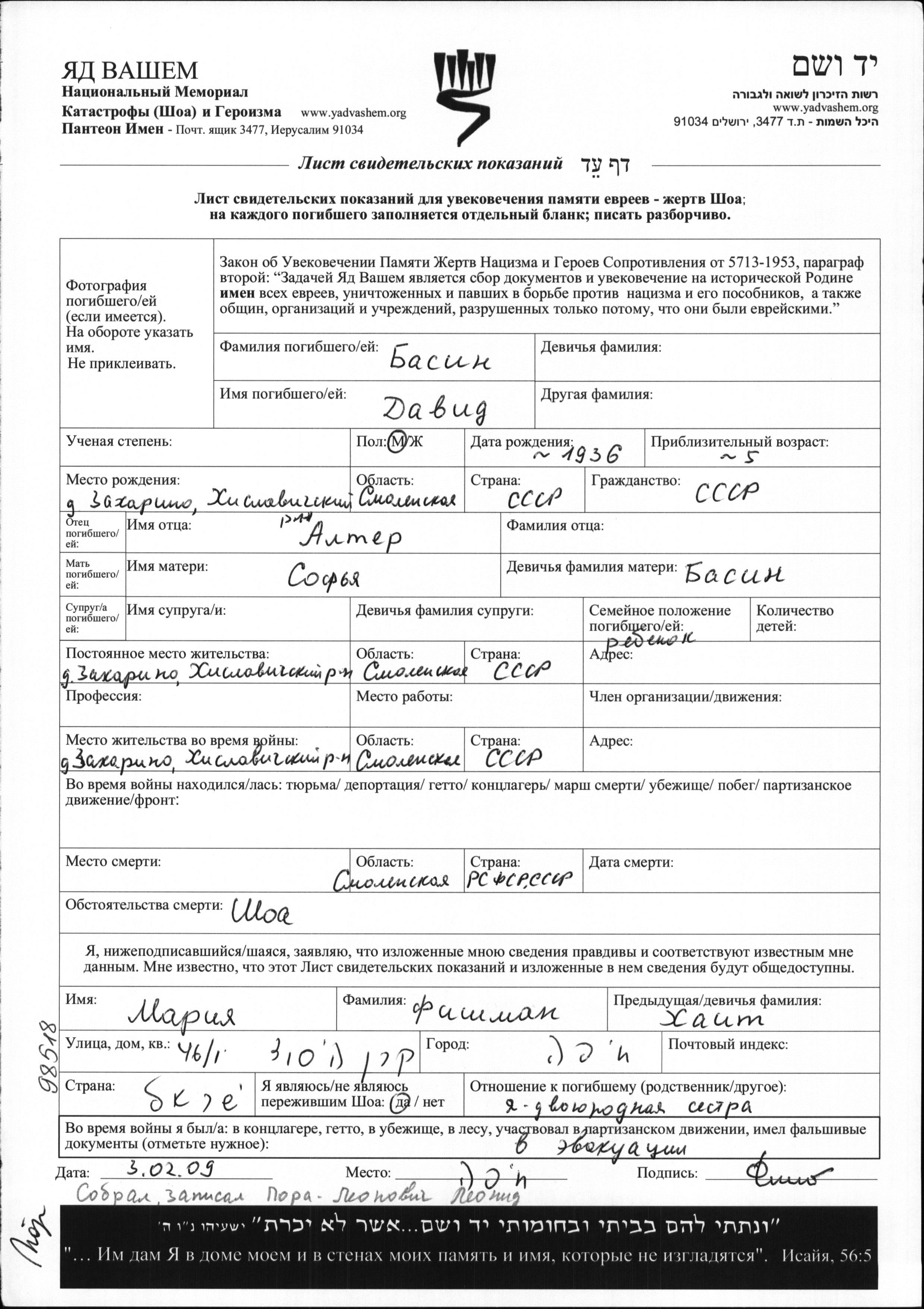 David Basin was born in Zakharino, Russia (USSR), 1936 to Alter and Sofya nee Basin. He was child. Prior to WWII he lived in Zakharino, Russia (USSR). During the war he was in Zakharino, Russia (USSR). David was murdered in the Shoah. Place of death: Smolensk, Russia (USSR).