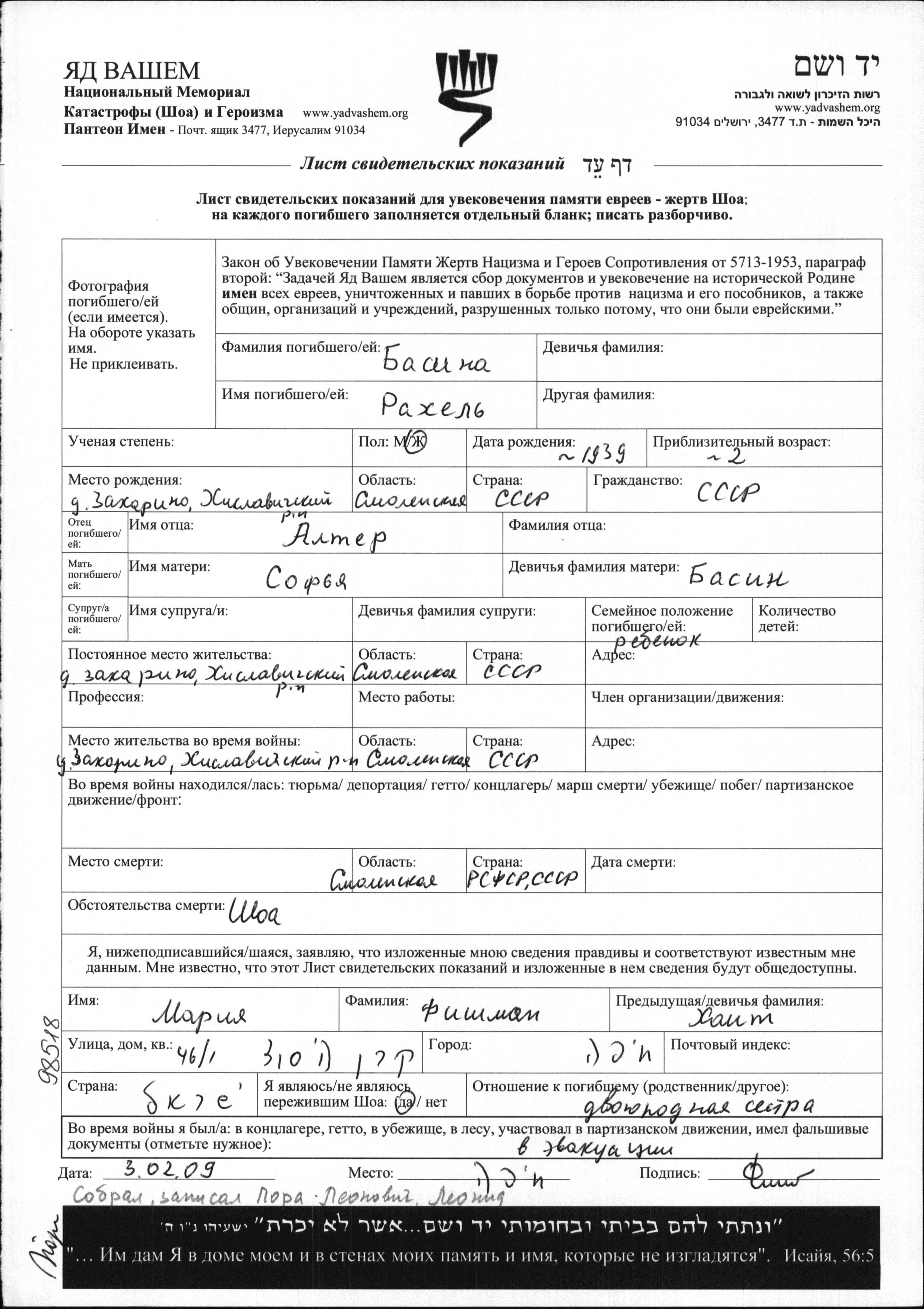 Rakhel Basina was born in Zakharino, Russia (USSR), 1939 to Alter and Sofya. She was child. Prior to WWII she lived in Zakharino, Russia (USSR). During the war she was in Zakharino, Russia (USSR). Rakhel was murdered in the Shoah. Place of death: Smolensk, Russia (USSR).
