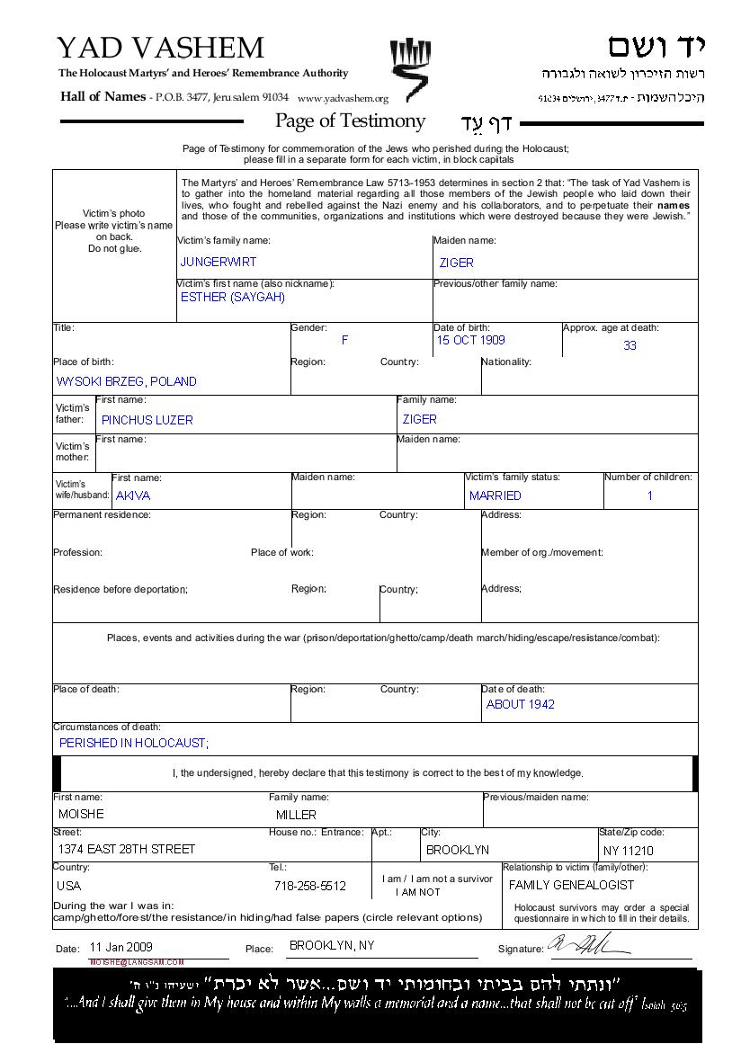 Esther Faygah Jungerwirt nee Ziger was born in Wysoki Brzeg, Poland, 1909 to Pinchus Luzer. She was married to Akiva. Esther Faygah was murdered in the Shoah. Place of death: unknown, 1942.