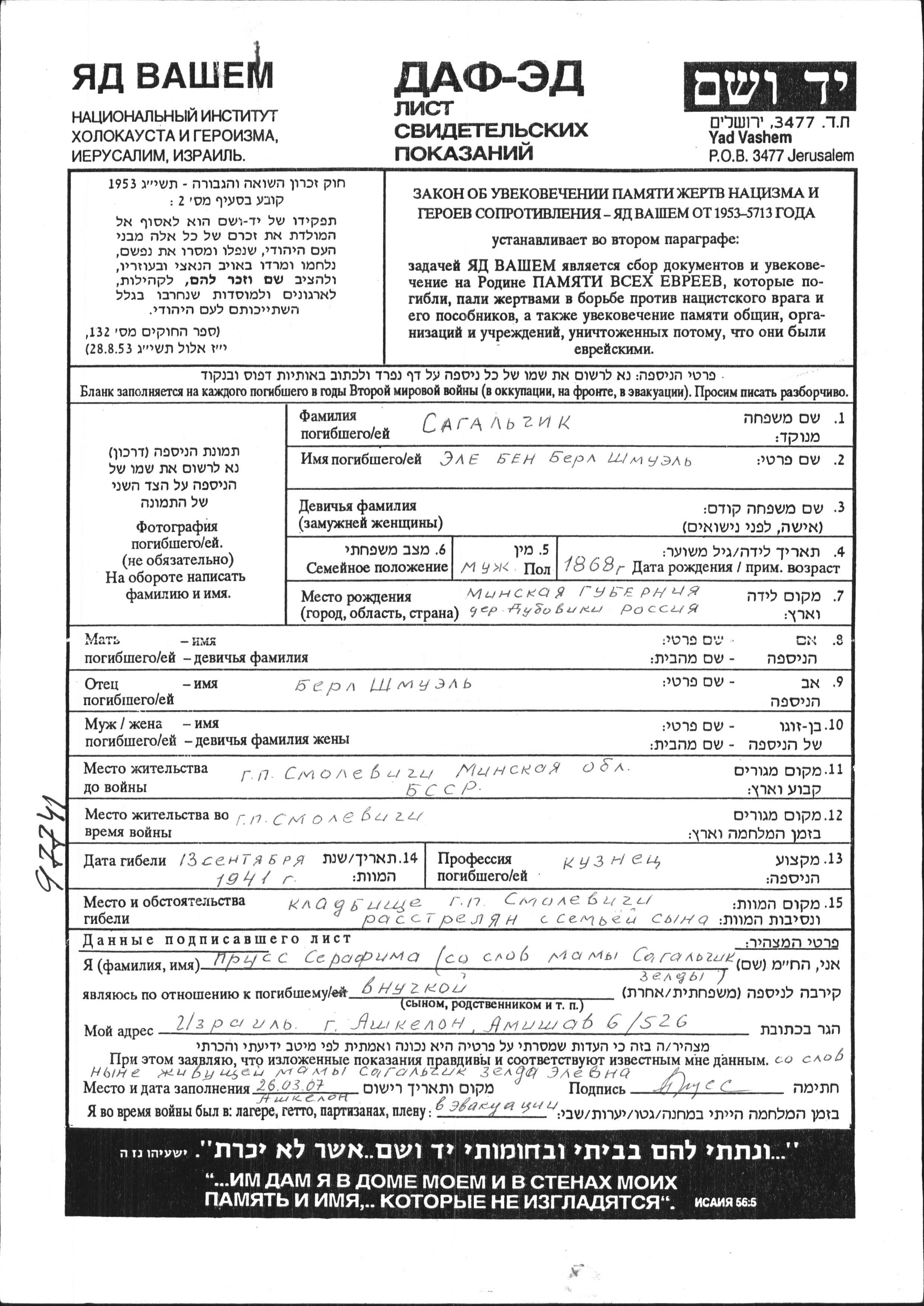 Ele Sagalchik was born in Duboviki, Belorussia (USSR), 1868 to Berl Shmuel. He was a blacksmith. Prior to WWII he lived in Smolevichi, Belorussia (USSR). During the war he was in Smolevichi, Belorussia (USSR). Ele was murdered in the Shoah. Place of death: Smolevichi, Belorussia (USSR), 13/09/1941.
