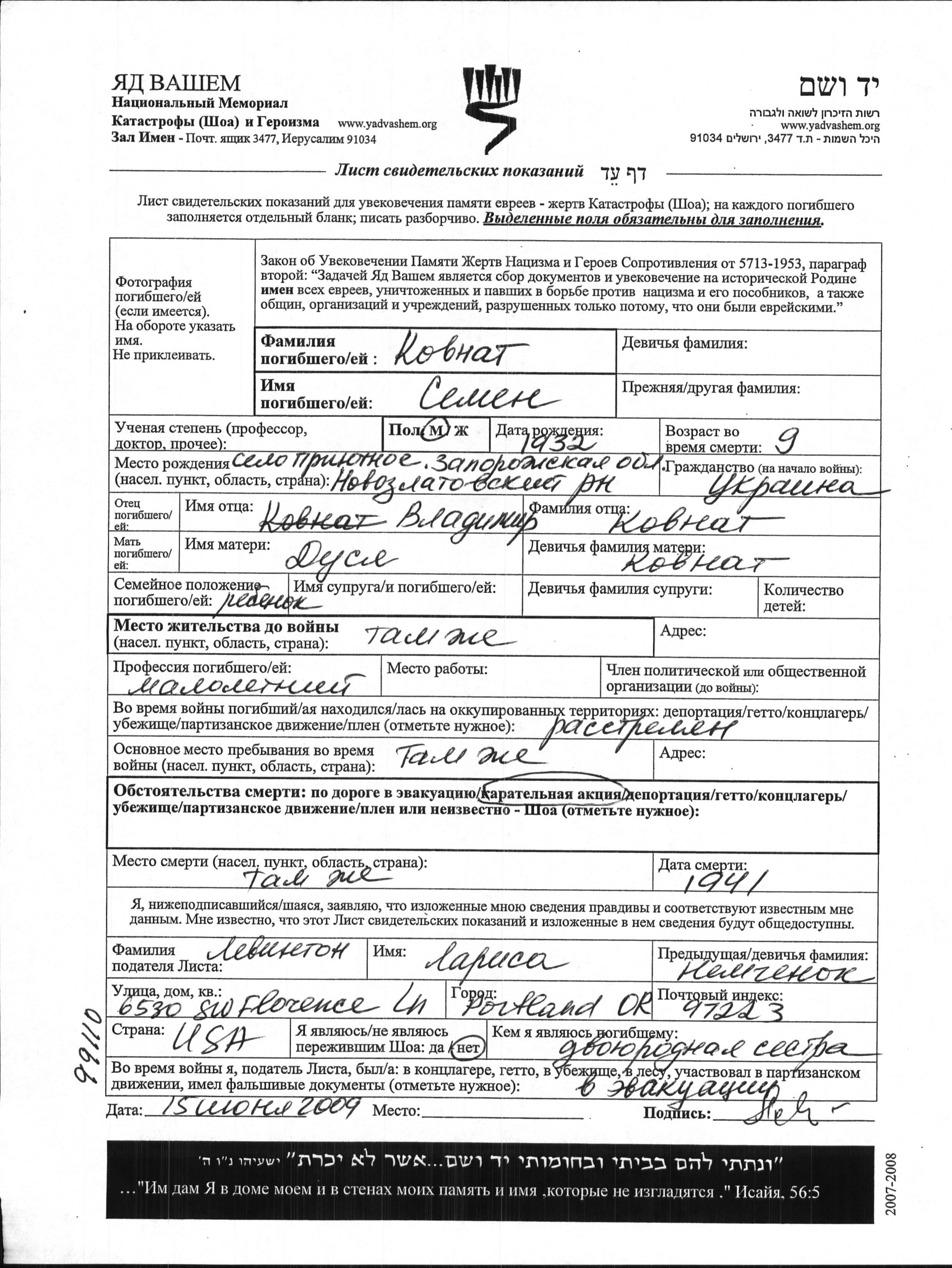 Kovnat Semyon 1932 Priyutnoye, Ukraine (USSR) Page of Testimony