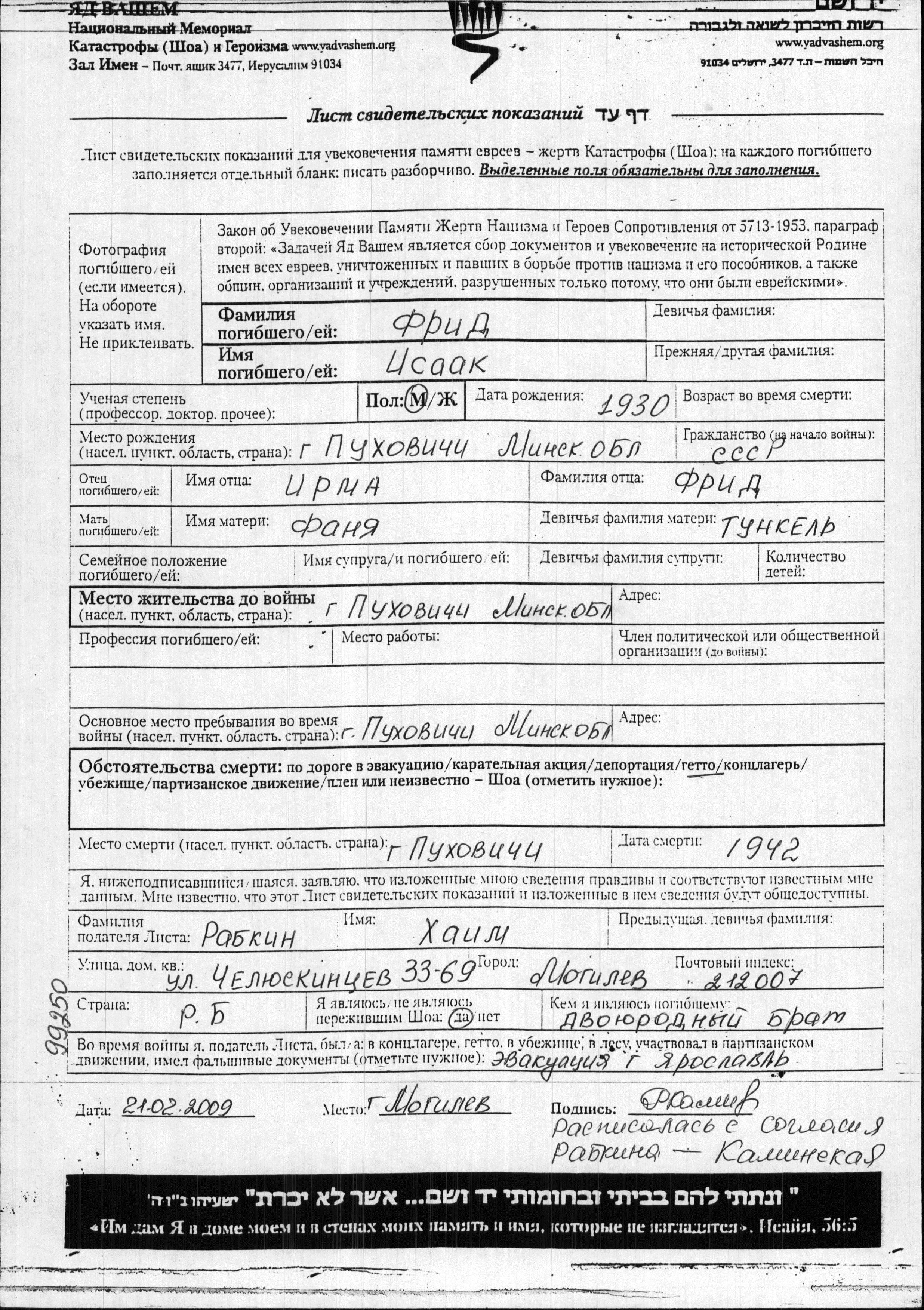 Frid Isaak 1930 Pukhovichi, Belorussia (USSR) Page of Testimony