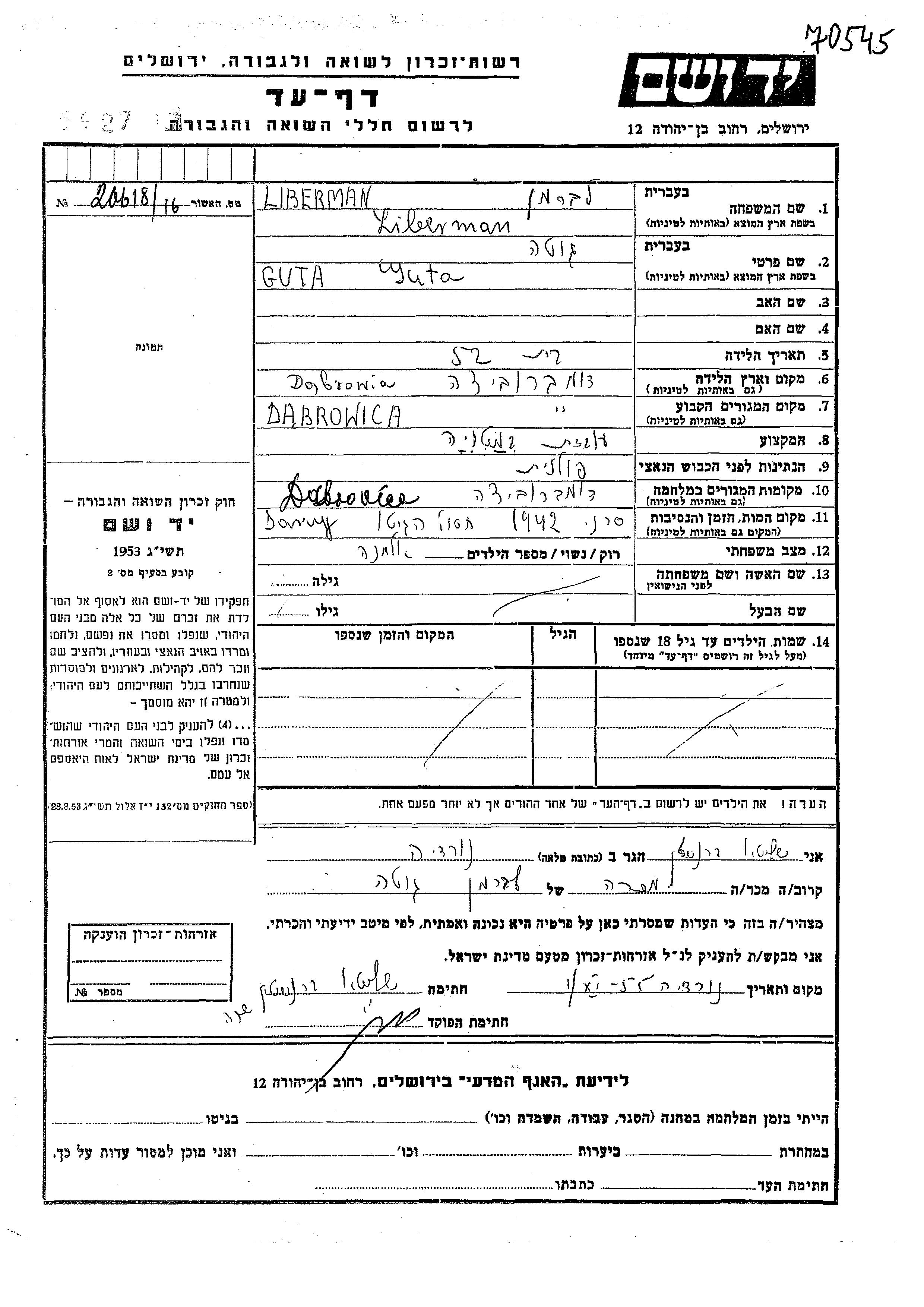 Guta Liberman Leberman was born in Dabrowice, Poland. She was a spinning mill and a widow. Prior to WWII she lived in Dabrowice, Poland. During the war she was in Dabrowice, Poland. Guta was murdered in the Shoah. Place of death: Sarny, 1942.